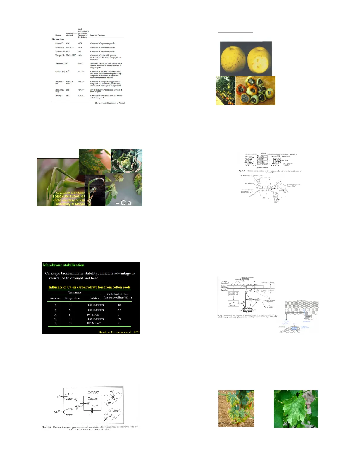 16-Dec-22 Magnesio (Mg2+) L' assorbimento del magnesio può essere fortemente depresso nei terreni acidi (pH<5,4) e dalla presenza di altri cationi come potassio, ammonio, calcio o manganese (spesso si verificano fenomeni di carenza per questi motivi) E' un elemento mobile nella pianta che può essere traslocato dalla parti più vecchie alla più giovani in fase di rapido sviluppo. Mg-carenza La concentrazione nei tessuti vegetali aumenta con l'età; nella vite le concentrazioni fogliari critiche dovrebbero collocarsi sotto al valore di 0,35%. 7 14 16 Ca svolge inoltre un ruolo chiave nei processi di trasduzione del segnale come un messaggero secondario. Regulation in plant cells Light, temperature Signal- Wounding Call wall [apoplasm) Cellulose Callose Plasma R Cytoplasm + ADP P Ht ATP syritase Inositol 1,4,5 triphosphate Ionase-+ phospho facts - Physiological Plasrsa Membras responses e.g., mANA 22Camodulin Caª Fig. 8.29 Model of the role of calcium as second messenger in the signal transduction in plan cells. R = receptor sites, e.g., phytochrome, or binding sites of hormones, e.g., ABA, IAA. ....... PATCH HO Phosphapraxis -IF- Receptor Channel 15 In questo caso, l'obiettivo è quello di aumentare la concentrazione citosolica del Ca per consentire il catione di esercitare i suoi effetti (attivazione di enzimi). Ca2+ Ca2+ \ Ca2+ |Ca2+ Ca2+D Ca2+ membrane 4 glucen 1.3 glucan Prote Q phospho rylation Ca2+ Cytoplasm (% or ppm of Dry Weight) Important Functions University of Maryla 6 8Biochimica agraria - Nutrizione minerale