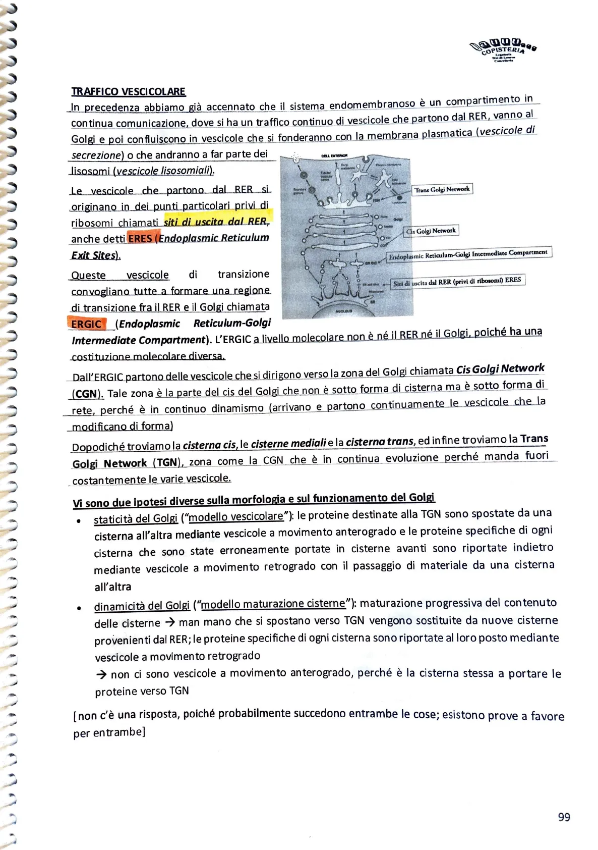 Trans Golgi Network Cis Golgi Network 100 1 Endoplasmic Reticulum-Golgi Intermediate Compartment Queste vescicole di transizione Siti di uscita dal RER (privi di ribosomi) ERES convogliano tutte a formare una regione di transizione fra il RER e il Golgi chiamata NUCLEUS ERGIC _(Endoplasmic Reticulum-Golgi Intermediate Compartment). L'ERGIC a livello molecolare non è né il RER né il Golgi, poiché ha una costituzione molecolare diversa.