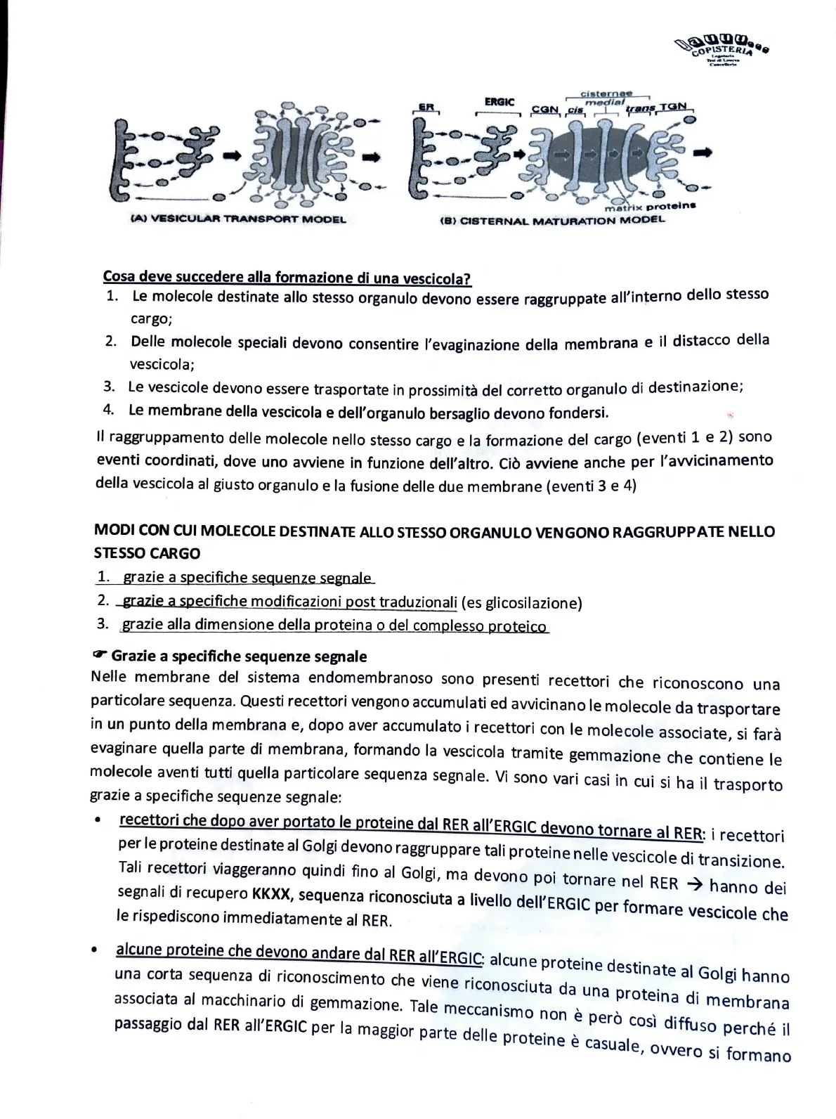 Documento della Copisteria sul traffico vescicolare. Il Pdf, di Biologia a livello universitario, esplora il traffico vescicolare e il ruolo del Golgi, analizzando i meccanismi di trasporto delle vescicole, la secrezione costitutiva e regolata, e i processi di endocitosi e fagocitosi.