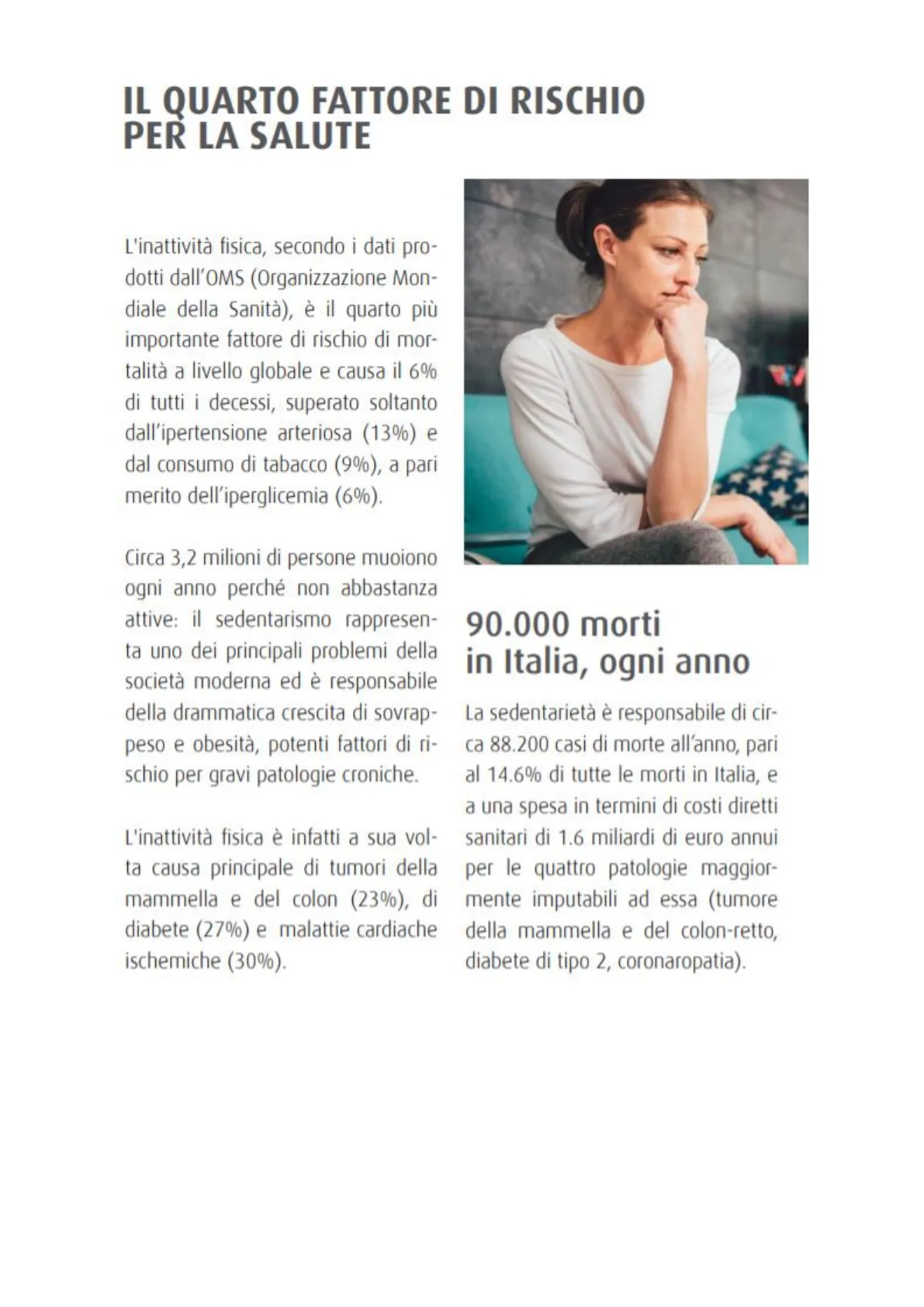 La sedentarietà è responsabile di cir- ca 88.200 casi di morte all'anno, pari al 14.6% di tutte le morti in Italia, e a una spesa in termini di costi diretti sanitari di 1.6 miliardi di euro annui per le quattro patologie maggior- mente imputabili ad essa (tumore della mammella e del colon-retto, diabete di tipo 2, coronaropatia).