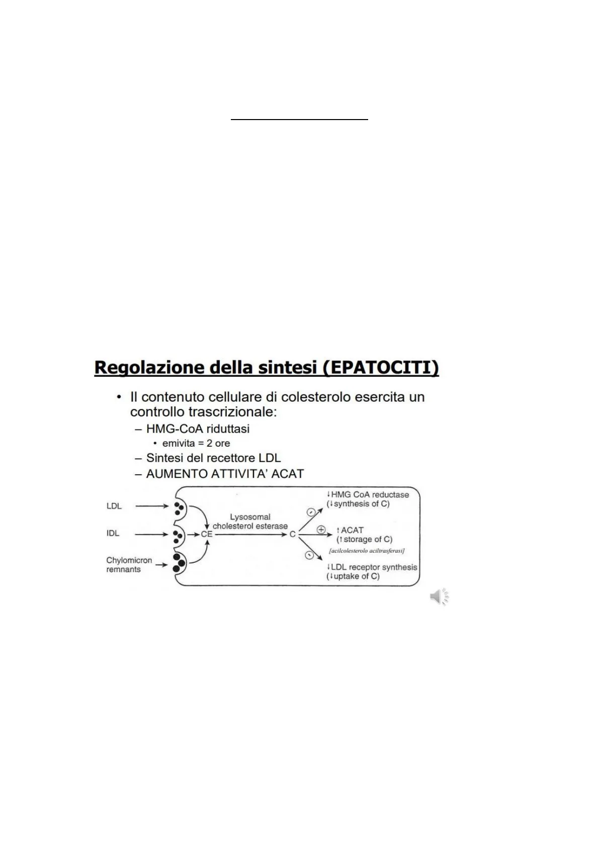 I HMG CoA reductase (I synthesis of C) LDL Lysosomal V cholesterol esterase + IDL ->CE > C 1 ACAT (1 storage of C) [acilcolesterolo aciltrasferasi] Chylomicron remnants ILDL receptor synthesis (' uptake of C)