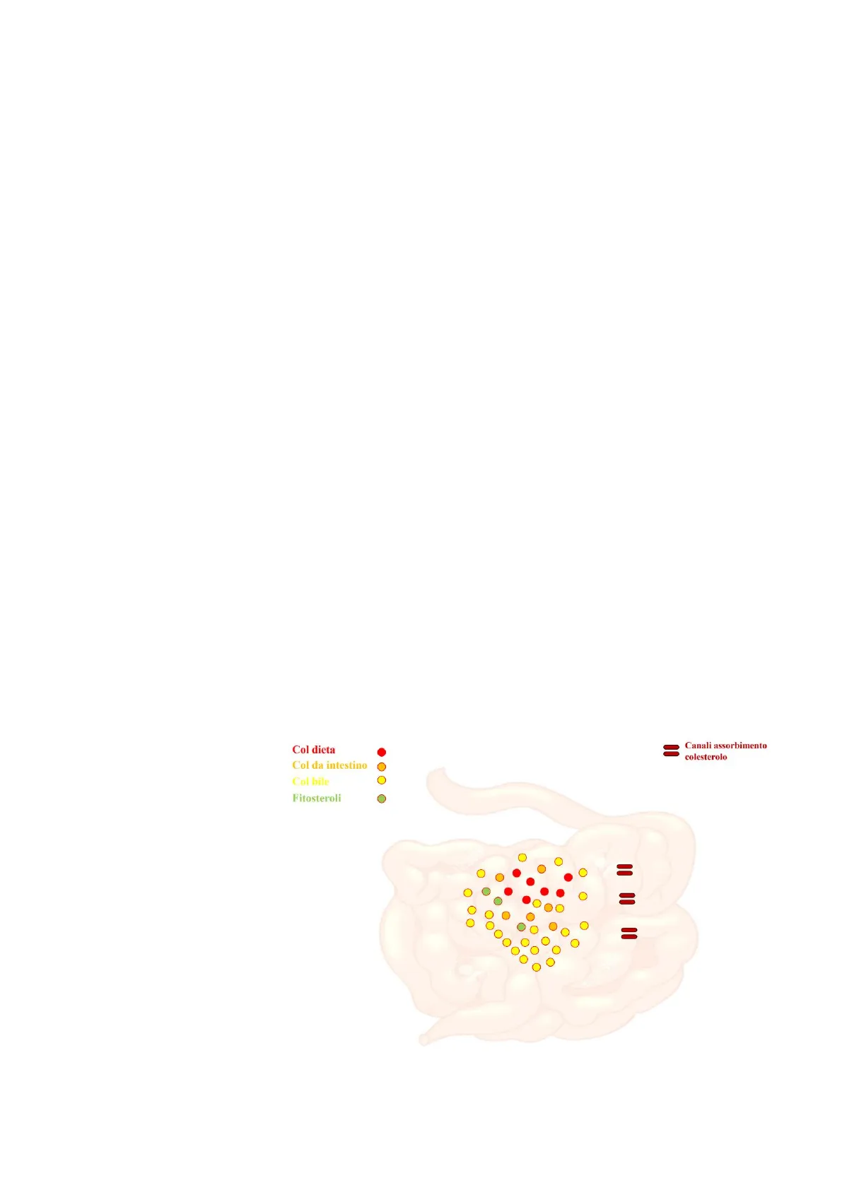 Come avviene l'assorbimento di colesterolo? L'assorbimento avviene attraverso un canale tra il lume intestinale e la cellula intestinale stessa, detto canale NPC1L1 (una mutazione del gene che codifica per questa proteina porta alla malattia di Niemann, caratterizzata da un assorbimento irregolare di colesterolo, causandone l'accumulo). Questo canale fa passare sia colesterolo che fitosterolo. Quindi il colesterolo entra nella cellula intestinale dove una parte verrà utilizzato per creare riserve di colesterolo, un'altra parte entrerà nel torrente circolatorio e un'ultima parte tornerà nel lume intestinale grazie ad un altro canale, formato da un dimero di proteine (ABCG5 e ABCG8, sono delle ATP binding cassette protein) che si apre quando vi è un eccesso di colesterolo nella cellula. Il secondo canale, inoltre, ha la particolarità di essere più affine per i fitosteroli, tanto che nella fitosterolemia, porta ad un accumulo di fitosteroli, sappiamo che la causa può essere la mutazione di una delle proteine.