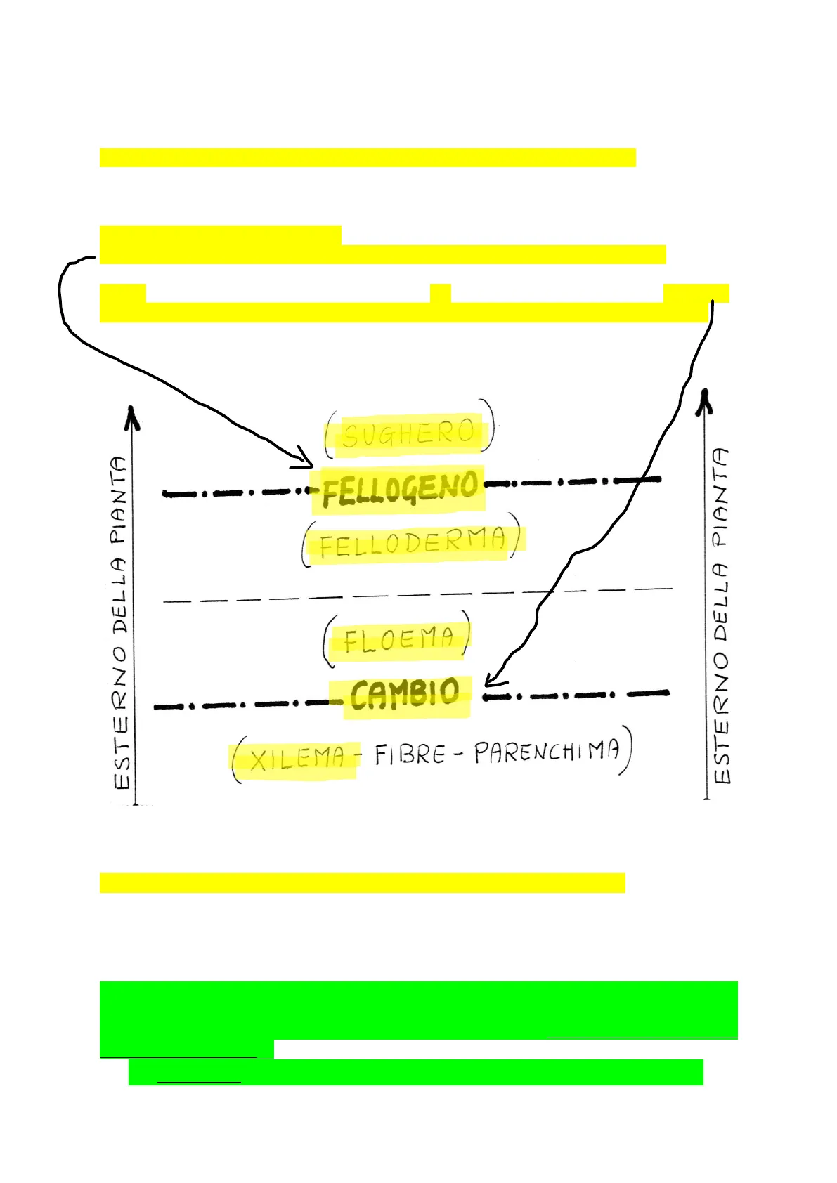 Considerazioni del tutto analoghe per quanto riguarda la crescita e la struttura secondaria di seguito considerate. Un numero più limitato di piante - comunemente chiamate ALBERI - hanno, oltre la crescita in lunghezza, anche una crescita in larghezza o CRESCITA SECONDARIA (sinonimi: CRESCITA LATERALE o - forse meglio - CRESCITA DIAMETRICA). Più esattamente questa crescita è presente nelle GIMNOSPERME (per esempio pini, abeti, cipressi eccetera) e nelle ANGIOSPERME DICOTILEDONI LEGNOSE (vale a dire tutti gli altri alberi, per esempio ciliegio, melo, querce, pioppi, castagno ... ). In nessun altro gruppo di vegetali è presente la crescita secondaria, salvo poche e parziali eccezioni (Per maggior chiarezza vedi la classificazione del Regno Vegetale a pagina 117). Le Palme e i Bambù, pur essendo piante di consistenza legnosa di notevoli dimensioni, sono Monocotiledoni e sono quindi prive di crescita diametrica.La crescita secondaria è resa possibile dai meristemi secondari o CAMBI. In una sezione trasversale del fusto possiamo immaginare i CAMBI come due cerchi concentrici vicinissimi tra loro e poco al di sotto della corteccia. Il cambio più esterno è chiamato CAMBIO SUBERO-FELLODERMICO o più semplicemente FELLOGENO e produce SUGHERO verso l'esterno e FELLODERMA verso l'interno. L'altro cambio, poco più interno del precedente, è il CAMBIO CRIBRO-VASCOLARE O CAMBIO il quale produce FLOEMA (OLIBRO) verso l'esterno e XILEMA (o LEGNO) verso l'interno. Il cambio produce anche una certa quantità di FIBRE e di PARENCHIMA. SUGHERO ESTERNO DELLA PIANTA I FELLOGENO FELLODERMA FLOEMA - 1 CAMBIO XILEMA - FIBRE - PARENCHIMA ESTERNO DELLA PIANTA La STRUTTURA SECONDARIA è la parte di pianta prodotta dai cambi. Quindi nelle Gimnosperme e nelle Angiosperme dicotiledoni legnose la struttura primaria e quella secondaria coesistono nello stesso individuo vegetale. Semplificando un po': la struttura secondaria è la parte legnosa della pianta rivestita dalla corteccia; la struttura primaria e invece rappresentata da foglie, fiori, frutti e dalle estreme terminazioni dei fusti e delle radici alle spalle delle quali, infatti, inizia subito a differenziarsi la struttura secondaria. J NOTA BENE: quindi nella stessa stagione vegetativa, non l'anno successivo!