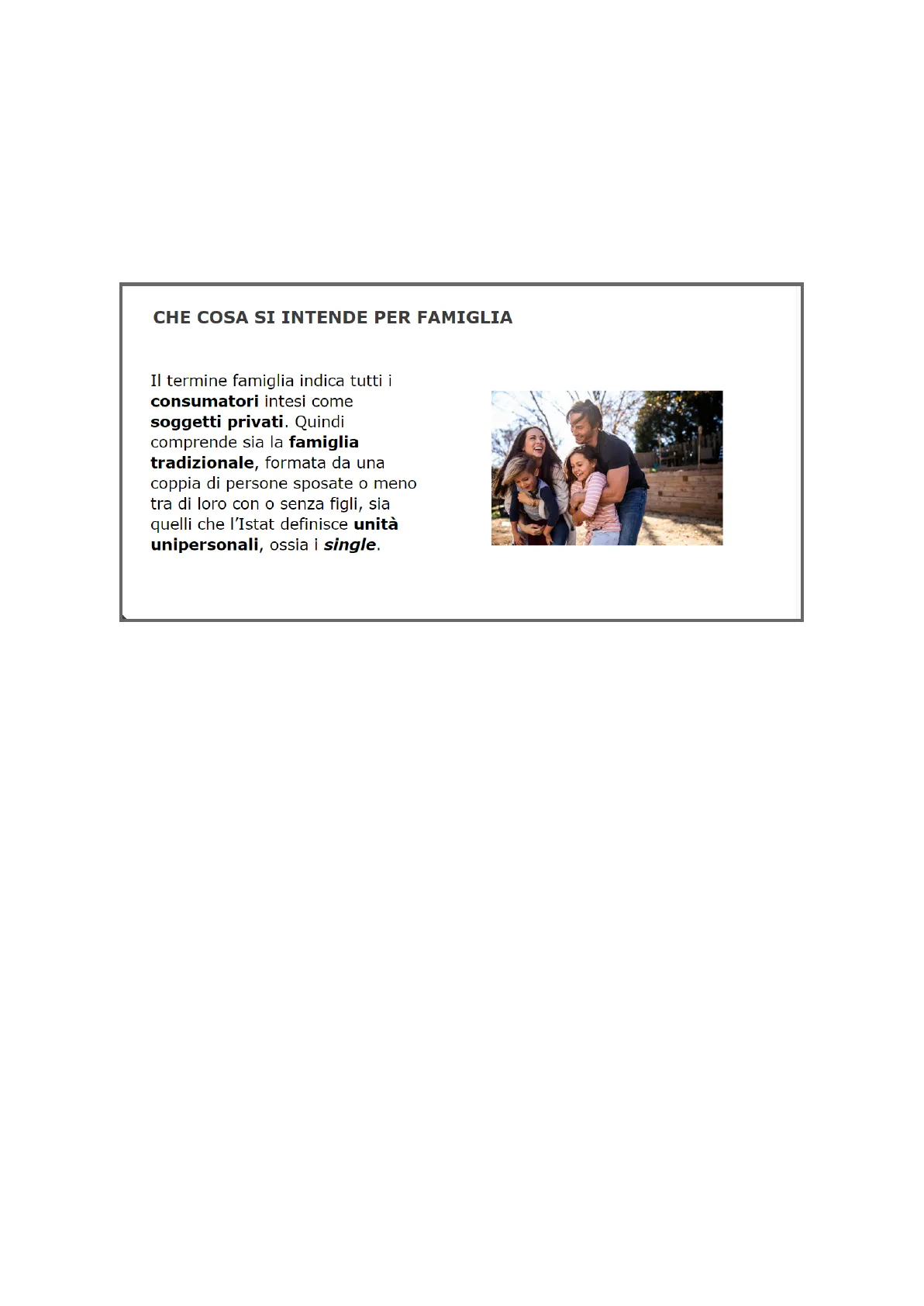 CHE COSA SI INTENDE PER FAMIGLIA Il termine famiglia indica tutti i consumatori intesi come soggetti privati. Quindi comprende sia la famiglia tradizionale, formata da una coppia di persone sposate o meno tra di loro con o senza figli, sia quelli che l'Istat definisce unità unipersonali, ossia i single. FAMIGLIA: sono il soggetto economico più importante e comprendono tutti i consumatori quali soggetti privati ( sia persone sposate, sia persone non sposate, single), offre il proprio lavoro alle imprese per poter ricevere una remunerazione. Parte delle loro entrate le consumano per soddisfare i propri bisogni, pagano i tributi allo Stato e quello che avanzano lo risparmiano e lo depositano presso le Banche ( i risparmi si trasformano in investimenti delle imprese)CHE COSA SI INTENDE PER FAMIGLIA Il termine famiglia indica tutti i consumatori intesi come soggetti privati. Quindi comprende sia la famiglia tradizionale, formata da una coppia di persone sposate o meno tra di loro con o senza figli, sia quelli che l'Istat definisce unità unipersonali, ossia i single.