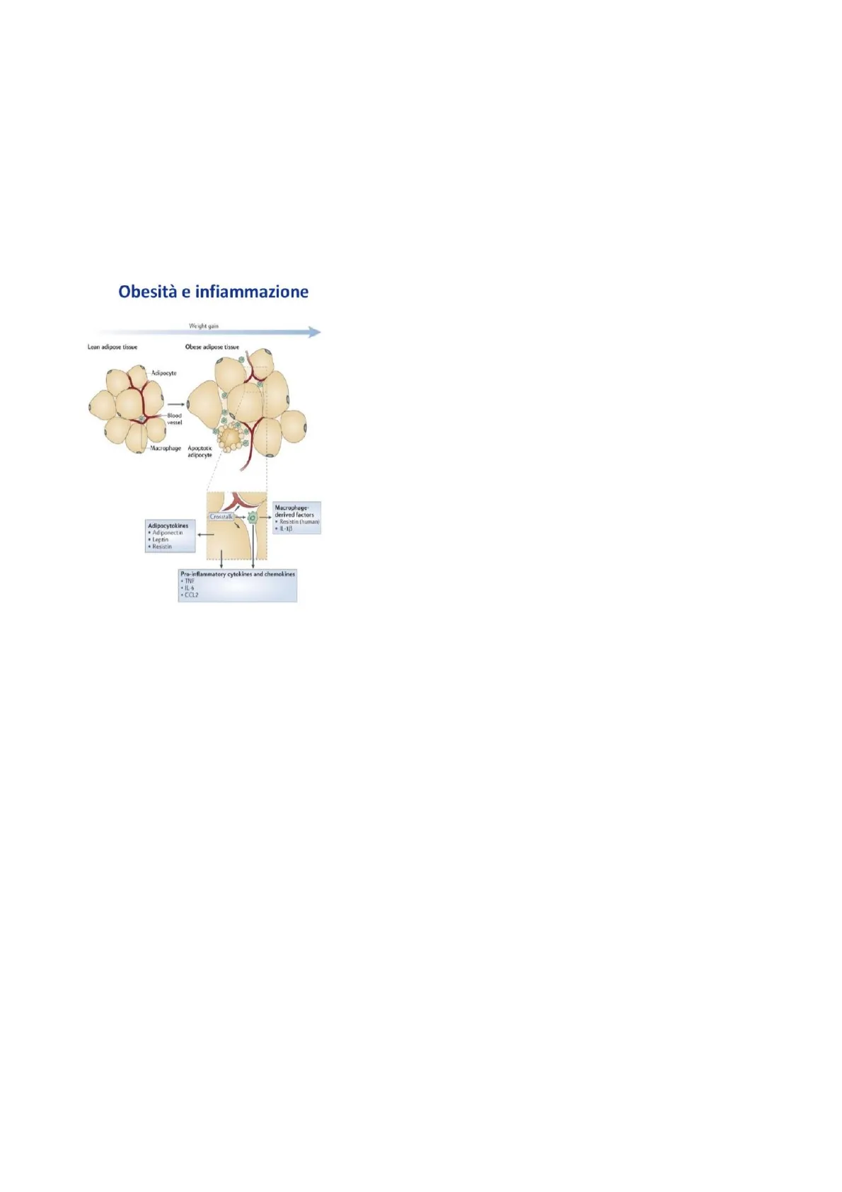 L'obesità è vista sempre di più come un fattore pro-infiammatorio. Il tessuto adiposo magro normale ha la composizione visibile in foto a sinistra: si vedono adipociti, vasi e macrofagi prevalentemente di tipo II (non infiammatori). Il suo assetto cambia completamente quando si instaura una situazione di obesità e, il tessuto adiposo infiammato del soggetto obeso, rilascia citochine infiammatorie.