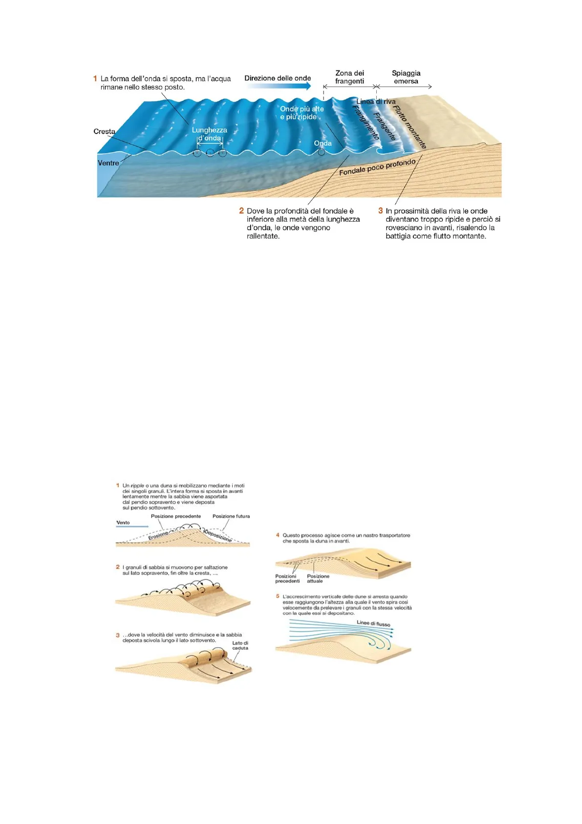 Le correnti marine come agente di trasporto: oltre alle correnti marine, gran parte dell'azione di trasporto di sedimenti per azione del mare avviene per via del moto ondoso. Le onde del mare si propagano esattamente come tutte le onde elastiche, ovvero senza spostamento di materia. Si definisce lunghezza d'onda del moto ondoso la distanza tra due creste o ventri d'onda (fig. 1). Quando il fondale è poco profondo, o più correttamente la profondità è inferiore alla metà della lunghezza d'onda, le onde vengono rallentate ed iniziano a frangersi. Quando si arriva a riva le onde diventano troppo ripide e risalgono la riva con un flusso montante. Le onde hanno quindi un potere erosivo e di trasporto, riuscendo a sollevare e trasportare sul fondo i sedimenti nella direzione del moto ondoso. Se l'apporto di sedimenti in un ambiente costiero è inferiore al potere erosivo delle correnti marine, la spiaggia arretra, al contrario prograda verso il mare.1 La forma dell'onda si sposta, ma l'acqua rimane nello stesso posto. Direzione delle onde Zona dei frangenti Spiaggia emersa K 1 *- 1 Linea di riva Onde più alte e più ripide Cresta Lunghezza d'onda| Onda Fondale poco profondo 2 Dove la profondità del fondale è inferiore alla metà della lunghezza d'onda, le onde vengono rallentate. 3 In prossimità della riva le onde diventano troppo ripide e perciò si rovesciano in avanti, risalendo la battigia come flutto montante. Figura 1. Illustrazione del meccanismo di propagazione e rottura del moto ondoso.