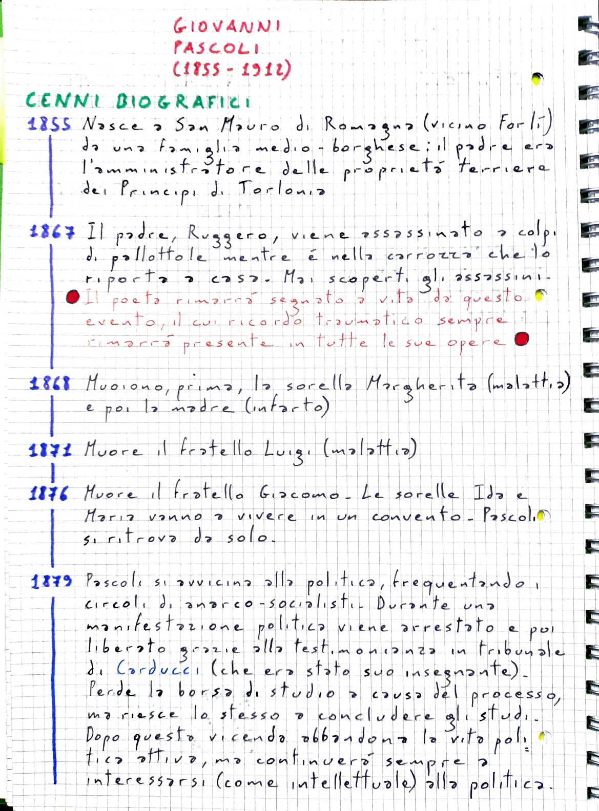 Documento su Giovanni Pascoli, cenni biografici. Il Pdf, destinato a studenti di scuola superiore, analizza la vita e l'opera del poeta, la poetica del Fanciullino, il Decadentismo e lo stile, con un confronto tra Pascoli e Leopardi.