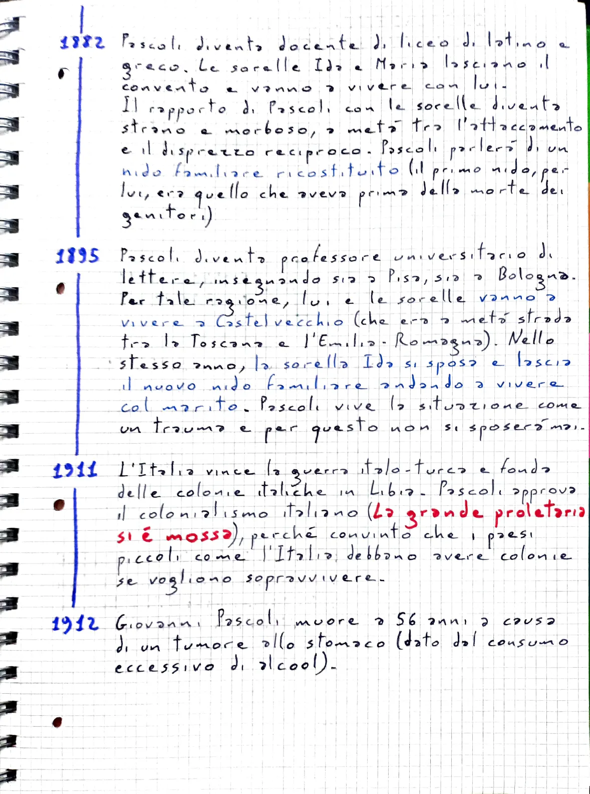 1882 Pascoli diventa docente di liceo di latino a greco. Le sorelle Ida e Maria lasciano il convento e vanno a vivere con lui. Il rapporto di Pascoli con le sorelle diventa strano a morboso, a metà tra l'attaccamento e il disprezzo reciproco. Pascoli parlerò di un nido familiare ricostituito (il primo nido, per lui, era quello che aveva prima della morte del genitori)