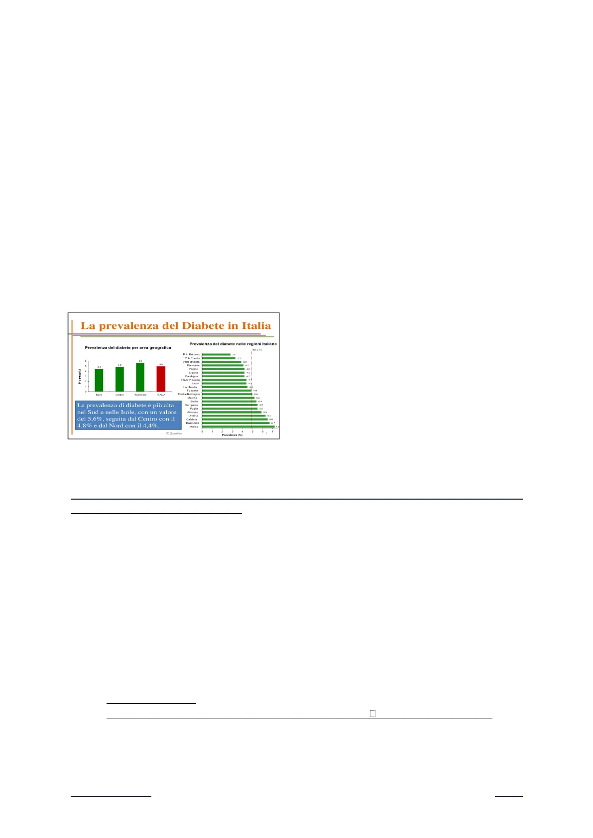 La prevalenza di diabete è più alta nel Sud e nelle Isole, con un valore del 5,6%, seguita dal Centro con il 4,8% e dal Nord con il 4,4%.5.biochimicaclinica - Prof.Gambino 30.10.2024