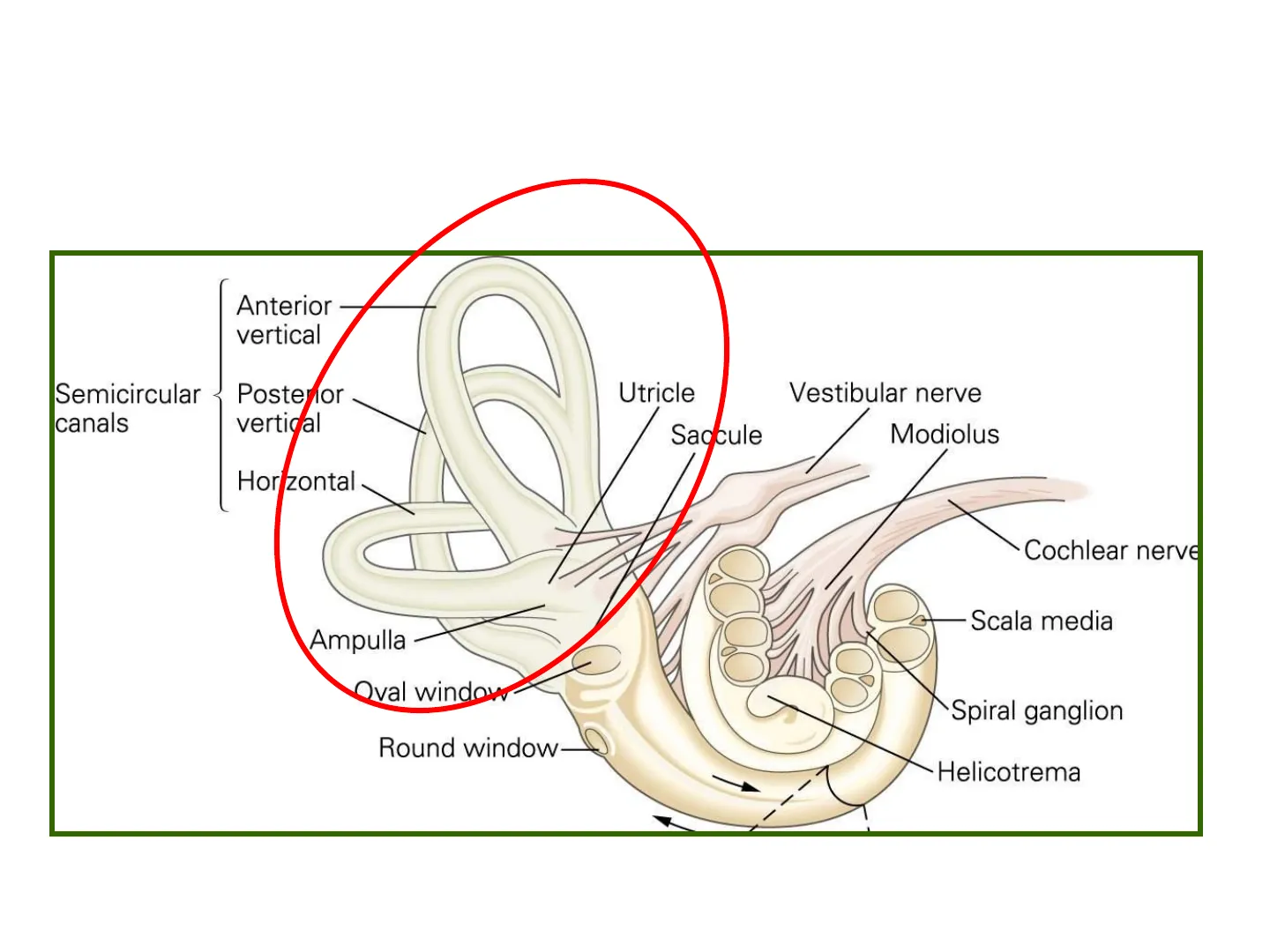 Anterior vertical Semicircular canals Postenfor vertical Utricle Vestibular nerve Sadcule Modiolus Horizontal Cochlear nerve Scala media Ampulla Qval window Spiral ganglion Round window HelicotremaCanale posteriore Sinistra destra Canale superiore Canale orizzontale