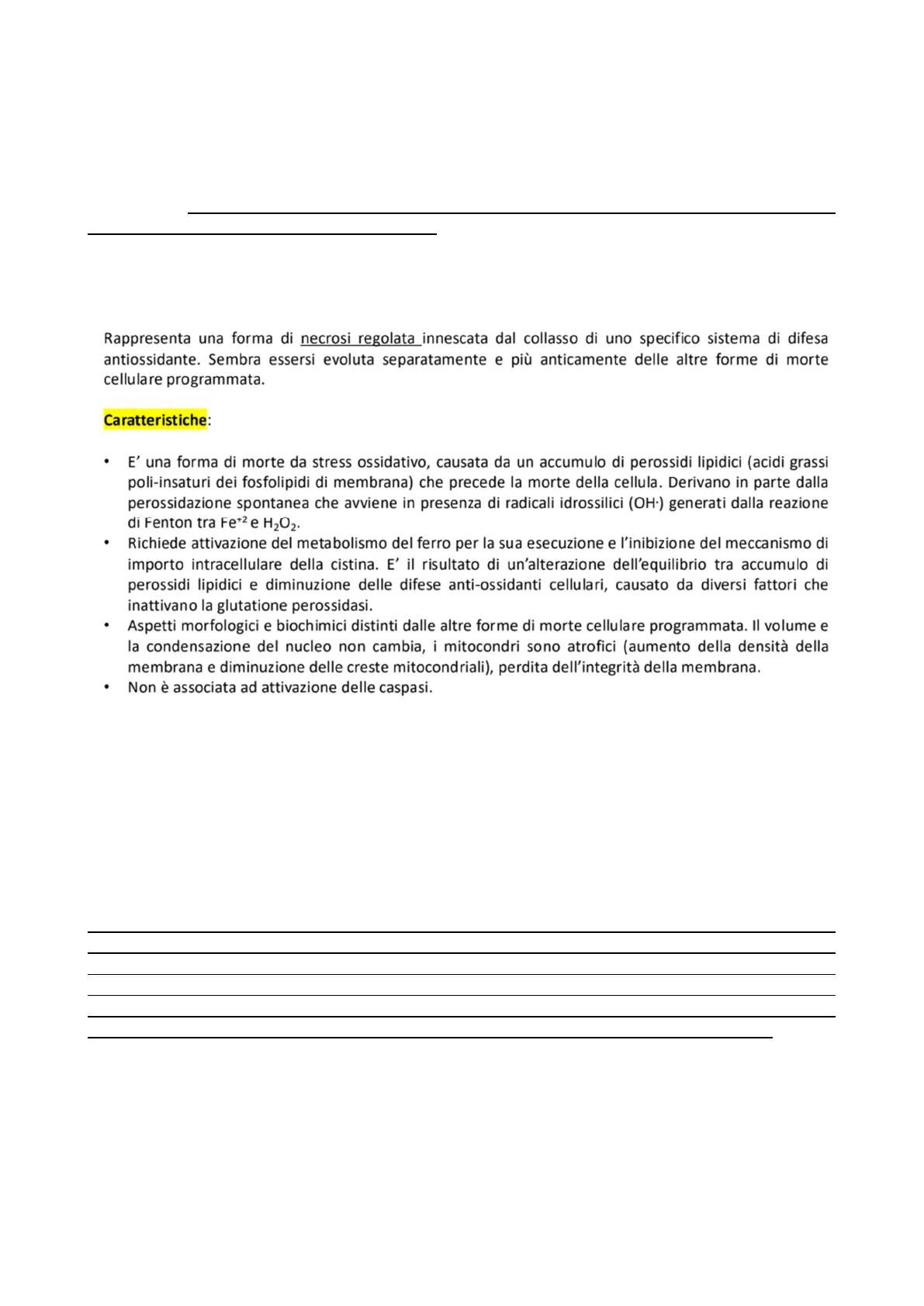 Quindi il meccanismo è diverso, la morfologia è diversa, le cellule che muoiono per ferroptosi non hanno dei caratteri e una morfologia rilevabile con il microscopio ottico, al microscopio elettronico si può notare l'assenza di frammentazione del nucleo a differenza dell'apoptosi e assenza della condensazione della cromatina. Le cellule diventano più piccole ma non c'è un evidente condensazione del citoplasma, c'è un cambiamento a livello dei mitocondri che presentano atrofia (le membrane dei mitocondri aumentano di densità e c'è una diminuzione delle creste mitocondriali). Non è facile distinguere le cellule che vanno incontro a ferroptosi.Inoltre non è associata ad attivazione delle caspasi. È una forma di morte che dal punto di vista evolutivo è molto più antica delle altre tanto che è stata ritrovata in cellule filologicamente molto distanti dai mammiferi (protozoi e funghi).