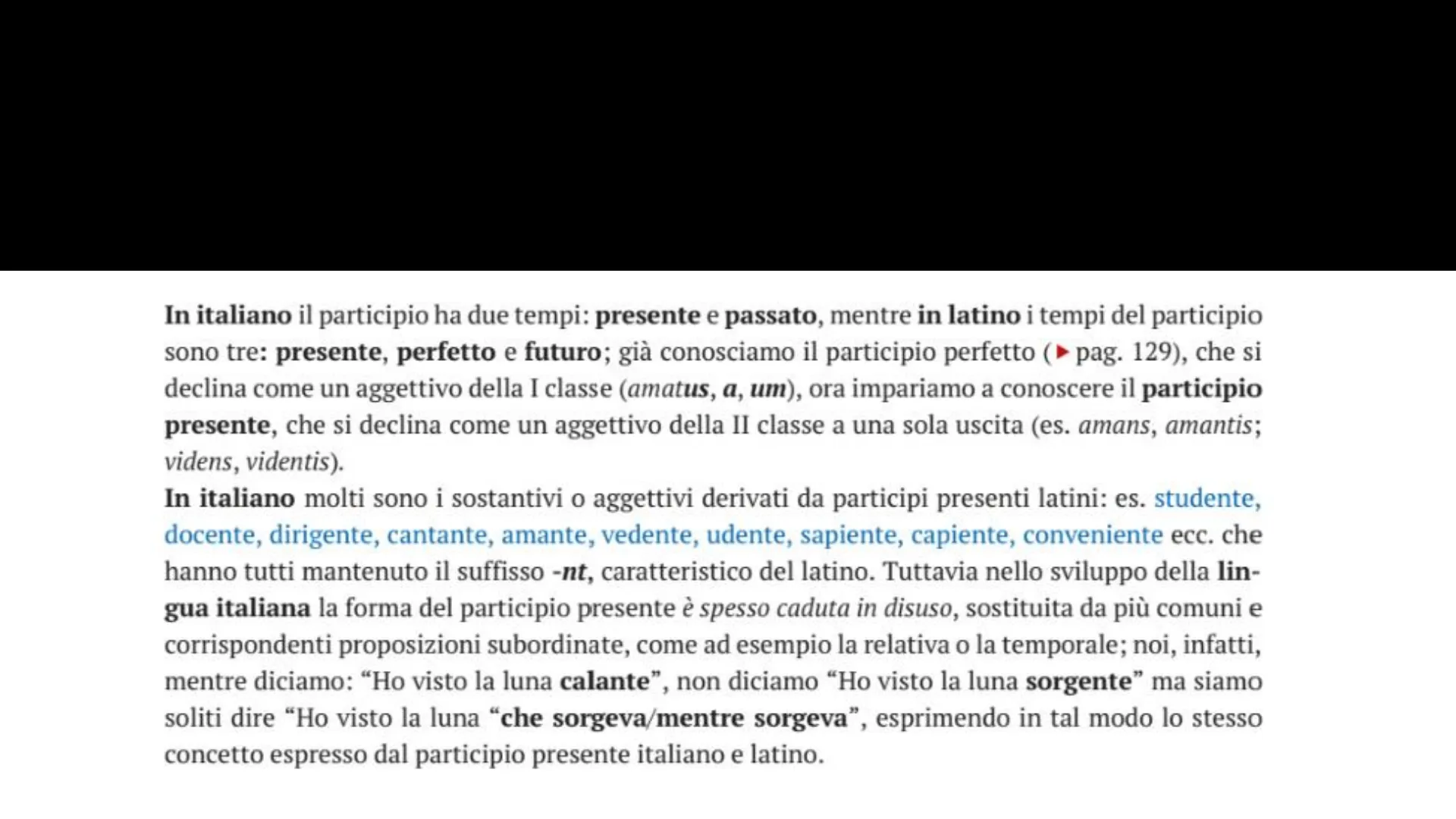 In italiano il participio ha due tempi: presente e passato, mentre in latino i tempi del participio sono tre: presente, perfetto e futuro; già conosciamo il participio perfetto ( pag. 129), che si declina come un aggettivo della I classe (amatus, a, um), ora impariamo a conoscere il participio presente, che si declina come un aggettivo della II classe a una sola uscita (es. amans, amantis; videns, videntis). In italiano molti sono i sostantivi o aggettivi derivati da participi presenti latini: es. studente, docente, dirigente, cantante, amante, vedente, udente, sapiente, capiente, conveniente ecc. che hanno tutti mantenuto il suffisso -nt, caratteristico del latino. Tuttavia nello sviluppo della lin- gua italiana la forma del participio presente è spesso caduta in disuso, sostituita da più comuni e corrispondenti proposizioni subordinate, come ad esempio la relativa o la temporale; noi, infatti, mentre diciamo: "Ho visto la luna calante", non diciamo "Ho visto la luna sorgente" ma siamo soliti dire "Ho visto la luna "che sorgeva/mentre sorgeva", esprimendo in tal modo lo stesso concetto espresso dal participio presente italiano e latino.