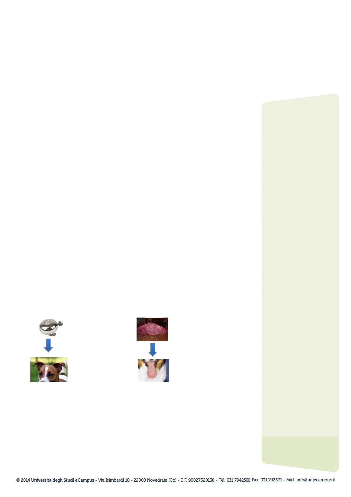 STIMOLO NEUTRO: suono del campanello STIMOLO INCONDIZIONATO: cibo RISPOSTA NON CORRELATA CON LA CARNE: il cane drizza le orecchie RISPOSTA INCONDIZIONATA: salivazione Figura 18.1. Situazione precedente il condizionamento Pag. 2 c 2014 Università degli Studi eCampus - Via Isimbardi 10 - 22060 Novedrate (Co) - C.F. 90027520130 - Tel: 031.7942500 Fax: 031.792631 - Mail: info@uniecampus.itCorso di Laurea: Scienze e Tecniche Psicologiche(D. M. 270/04) Insegnamento: Psicologia Generale nº Lezione: 19 Titolo: L'apprendimento 1 Ma che cosa avviene durante il condizionamento? Prima della presentazione del cibo, come accennato in precedenza, viene sempre fatto suonare un campanello. Il suono del campanello si associa così allo stimolo incondizionato (la carne) e riesce a provocare la stessa risposta (salivazione) che viene naturalmente prodotta dallo stimolo incondizionato. In Figura 18.2 è possibile osservare visivamente questa fase del condizionamento.