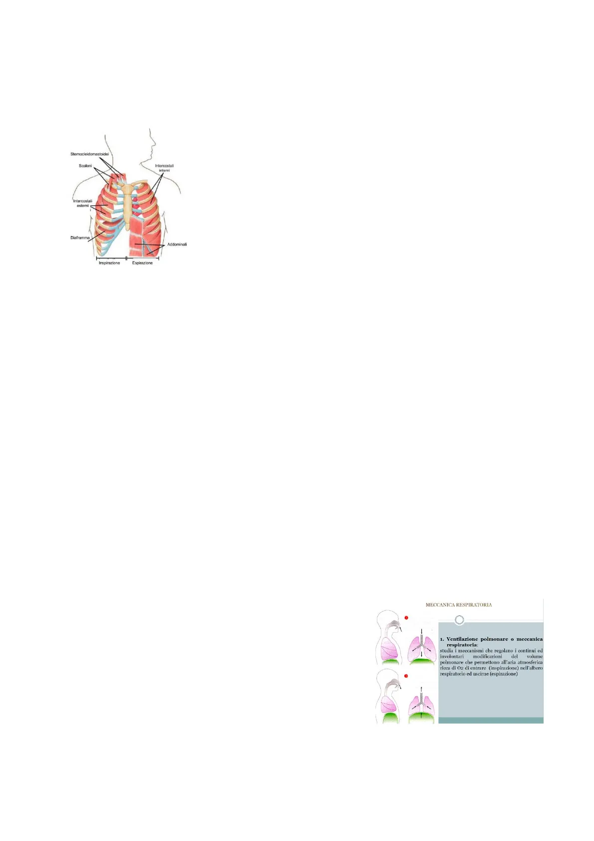 L'inspirazione è sempre un processo attivo che richiede la contrazione del diaframma attraverso un consumo di energia. Che cosa succede quindi al diaframma durante l'inspirazione? Il segnale di attivazione del ciclo inspiratorio avviene da parte di un piccolo gruppo di neuroni localizzato nel tronco encefalico (centro automatico che controlla la respirazione), che tramite il nervo frenico raggiunge il diaframma e manda il segnale di contrazione. Quando questo segnale arriva al diaframma, viene attivato e si contrae. Che cosa fa contraendosi? La particolare conformazione di questo muscolo, caratterizzata dalla cosiddetta cupola diaframmatica, una volta che riceve il segnale di contrazione, esercita una forza che dall'alto va verso il basso e quindi tende a trascinare la gabbia toracica verso il basso (concetto molto importante). 1Ogni qualvolta si respira, il diaframma aumenta il volume della gabbia toracica prevalentemente lungo un vettore che tende a far "scivolare" verso il basso, anche se di poco, la gabbia toracica. Nell'immagine ci sono altri due gruppi di muscoli, che sono i cosiddetti muscoli intercostali esterni (muscoli inspiratori), presenti in tutti gli spazi intercostali, sovrapposti ai muscoli Sternocleidomastoide intercostali interni (muscoli espiratori). I muscoli intercostali esterni servono Scaleni Intercostali interni per allargare la gabbia toracica durante l'inspirazione, mentre il muscolo Sternocleidomastoideo, ancorato in alto a livello del collo, serve a tirare Intercostali esterni verso l'alto la gabbia toracica. Qual è la differenza? Questi muscoli sono considerati accessori, ovvero vengono attivati solamente in condizioni Diaframma Addominali particolari. Vale a dire quando è necessario svolgere una respirazione molto Inspirazione Espirazione più veloce come, ad esempio, nel caso di un'attività fisica; nella corsa prolungata dobbiamo aumentare la disponibilità di ossigeno a livello dei nostri polmoni perché aumenta la quota di O2 che il nostro organismo consuma in maniera sistemica, perciò è necessario potenziare gli scambi. In una respirazione tranquilla, utilizzata durante la maggior parte della giornata, questi muscoli non vengono coinvolti; l'unico muscolo coinvolto è il diaframma. Solamente quando vi è necessità di accelerare gli scambi, o di aumentare la quantità di volume di aria che viene introdotta inspirando ed espirando vengono coinvolti altri gruppi muscolari, in particolare i muscoli espiratori: · intercostali interni · muscolo obliquo esterno · muscolo retto addominale Quindi quando vengono attivati questi muscoli espiratori? Sempre in condizioni di respirazione forzata, non in condizioni di respirazione tranquilla. Per l'inspirazione si attiva prevalentemente il diaframma, in condizioni invece di maggiore sollecitazione, possono essere coinvolti muscoli inspiratori accessori ed espiratori.