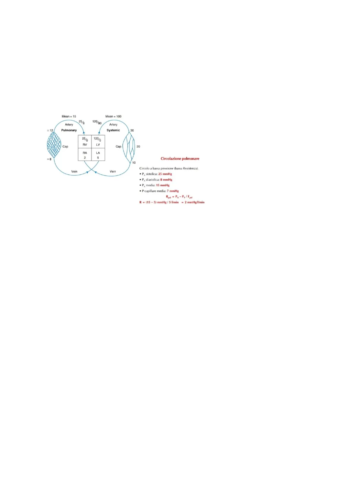 Perché parliamo di alta e bassa pressione? Perché, a fronte dei 120/80mmHg della pressione sistemica possiamo fare grossolanamente una media della pressione arteriosa attorno a 100mmHg a livello dell'arteria. Partiamo dalla descrizione della quota di pressione sistemica 120/80 quando il sangue viene pompato nell'arco 1aortico, scende lungo l'aorta, viene poi indirizzato attraverso i vari distretti principali delle arteriole e quando arriva ai capillari dove avviene il rilascio di ossigeno ai tessuti, la pressione è molto bassa ma ancora si trova a livelli apprezzabili di 20mmHg. Successivamente ritorna indietro con pressione venosa molto bassa, aiutata dalla spinta delle valvole e della contrazione muscolare (la pressione è così bassa che da sola non riesce nemmeno a risalire all'atrio destro). Quando arriva all'atrio destro la pressione è molto bassa nella vena cava ed è circa 2mmHg e a questo punto il Mean = 15 Mean = 100 sangue passa nel ventricolo destro dove 25/8 Artery 120/80 Artery 30 la pressione massima sistolica che si = 12 Pulmonary Systemic raggiunge è di 5mmHg, ossia 1/6 - 1/10 25% 120% Cap RV LV Cap 20 di quella sistemica che è molto bassa. RA LA =8 Circolazione polmonare 2 5 Tuttavia, questa è sufficiente per 10 Circolo a bassa pressione (bassa Resistenza). Vein Vein raggiungere un ampio distretto capillare · PA sistolica: 25 mmHg · PA diastolica: 8 mmHg e andare a irrorare una quota importante · PA media: 15 mmHg . P capillare media: 7 mmHg di albero vascolare che va poi a formare Rpol - PA - Py / Fpol R = (15 - 5) mmHg / 5 l/min = 2 mmHg/l/min la rete dei capillari polmonari.