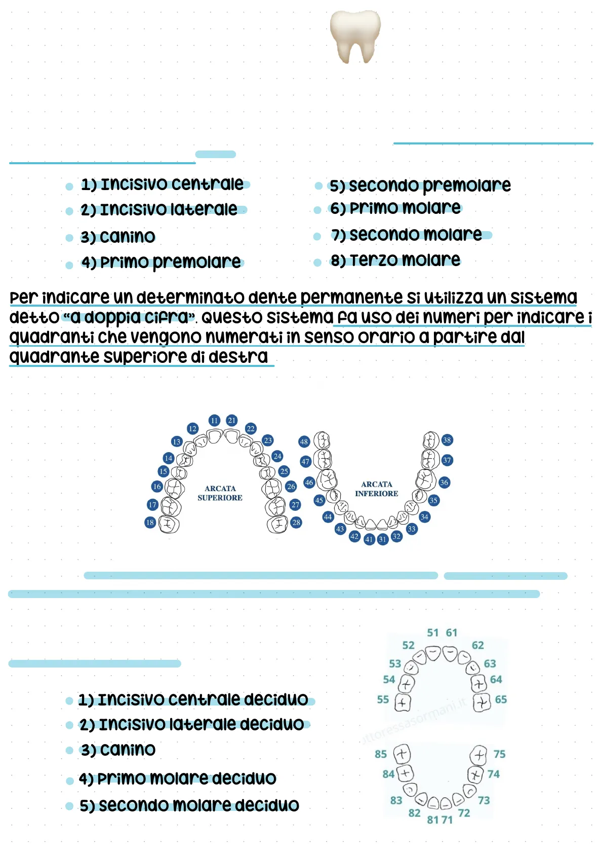 11 21 12 22 13 48 24 37 St 25 46 36 16 ARCATA SUPERIORE 17 27 JV 44 34 18 28 33 42 41 31 Esempio: 1.1 è l'incisivo centrale superiore di destra; 3.5 è il secondo premolare inferiore di sinistra. si leggono undici e trentacinque