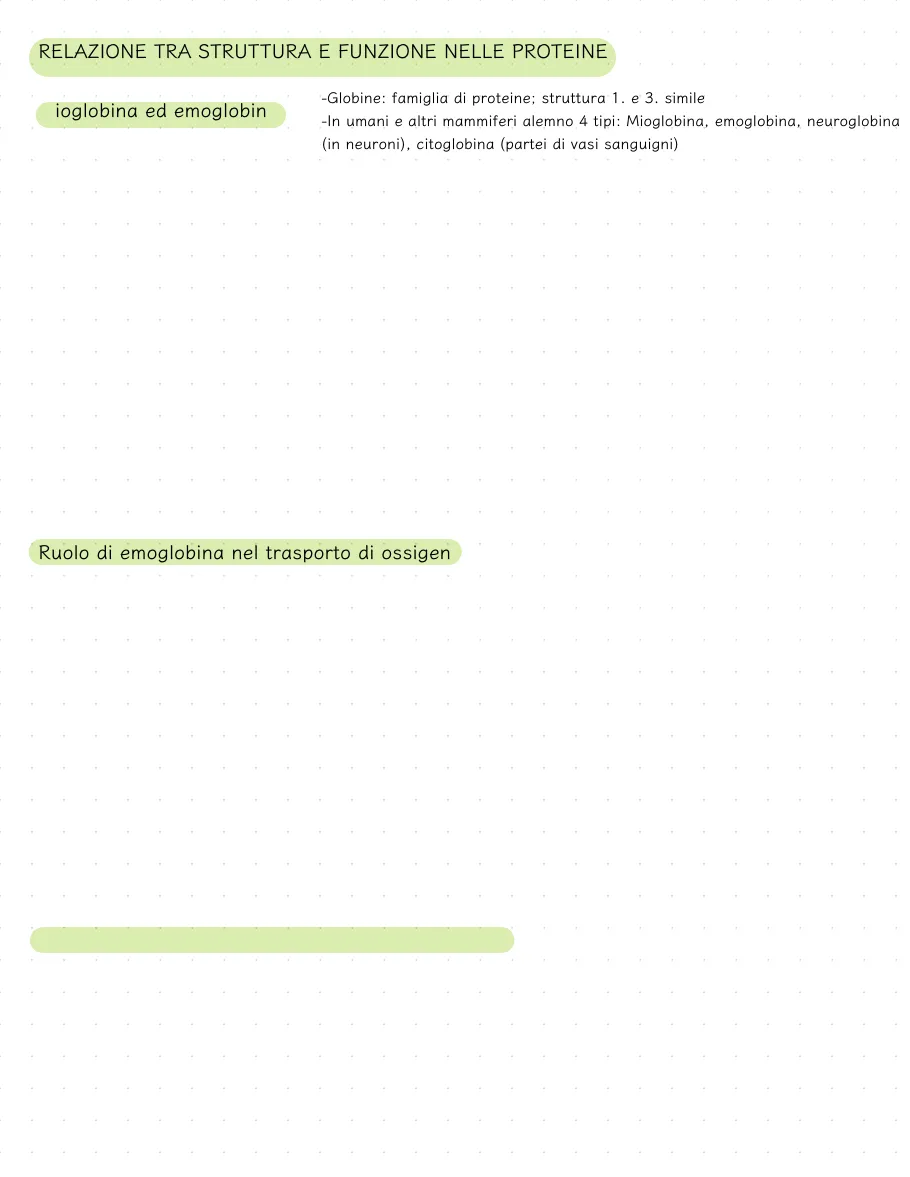 Documento sulla relazione tra struttura e funzione nelle proteine. Il Pdf esplora il ruolo di mioglobina ed emoglobina, il gruppo Eme e gli effettori allosterici come BPG, pH e CO2, per studenti universitari di Biologia.