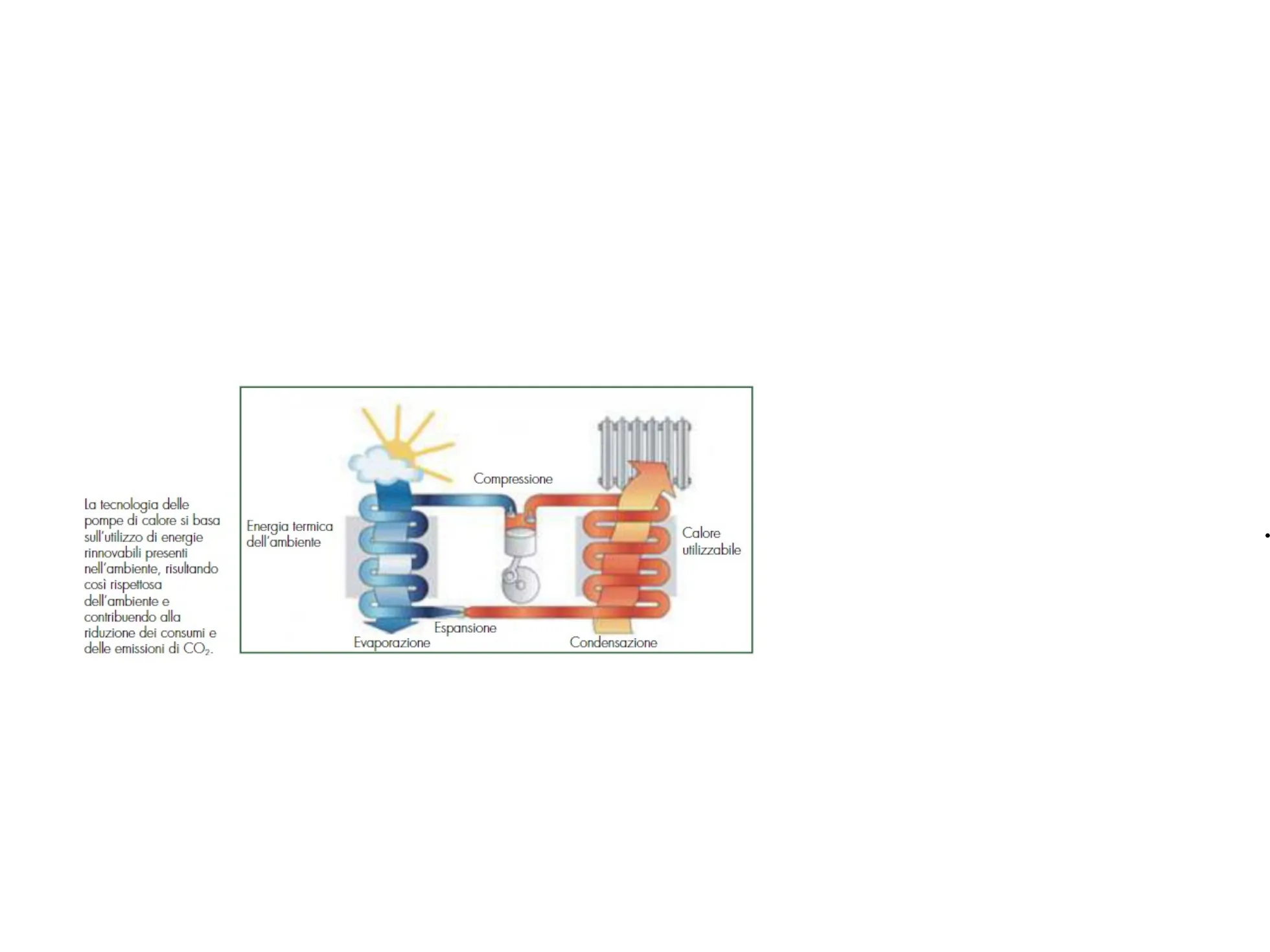 La pompa di calore è una macchina a fluido frigorigeno capace di trasferire (pompare) calore sottraendolo dall'ambiente aria, terra e acqua, a temperatura più bassa (sorgente fredda), per cederlo ad un altro ambiente a temperatura più alta (pozzo caldo) La tecnologia delle pompe di calore si basa sull'utilizzo di energie rinnovabili presenti nell'ambiente, risultando così rispettosa dell'ambiente e contribuendo alla riduzione dei consumi e delle emissioni di CO2. Compressione Energia termica dell'ambiente Calore utilizzabile Espansione Evaporazione CondensazioneLe pompe di calore sono macchine che, utilizzando il lavoro meccanico e sfruttando i principi fisici dei fluidi, sono in grado di cedere o assorbire calore quando avviene la vapo-rizzazione e la condensazione.Questo principio permette di far fluire il calore in senso opposto a quello naturale.