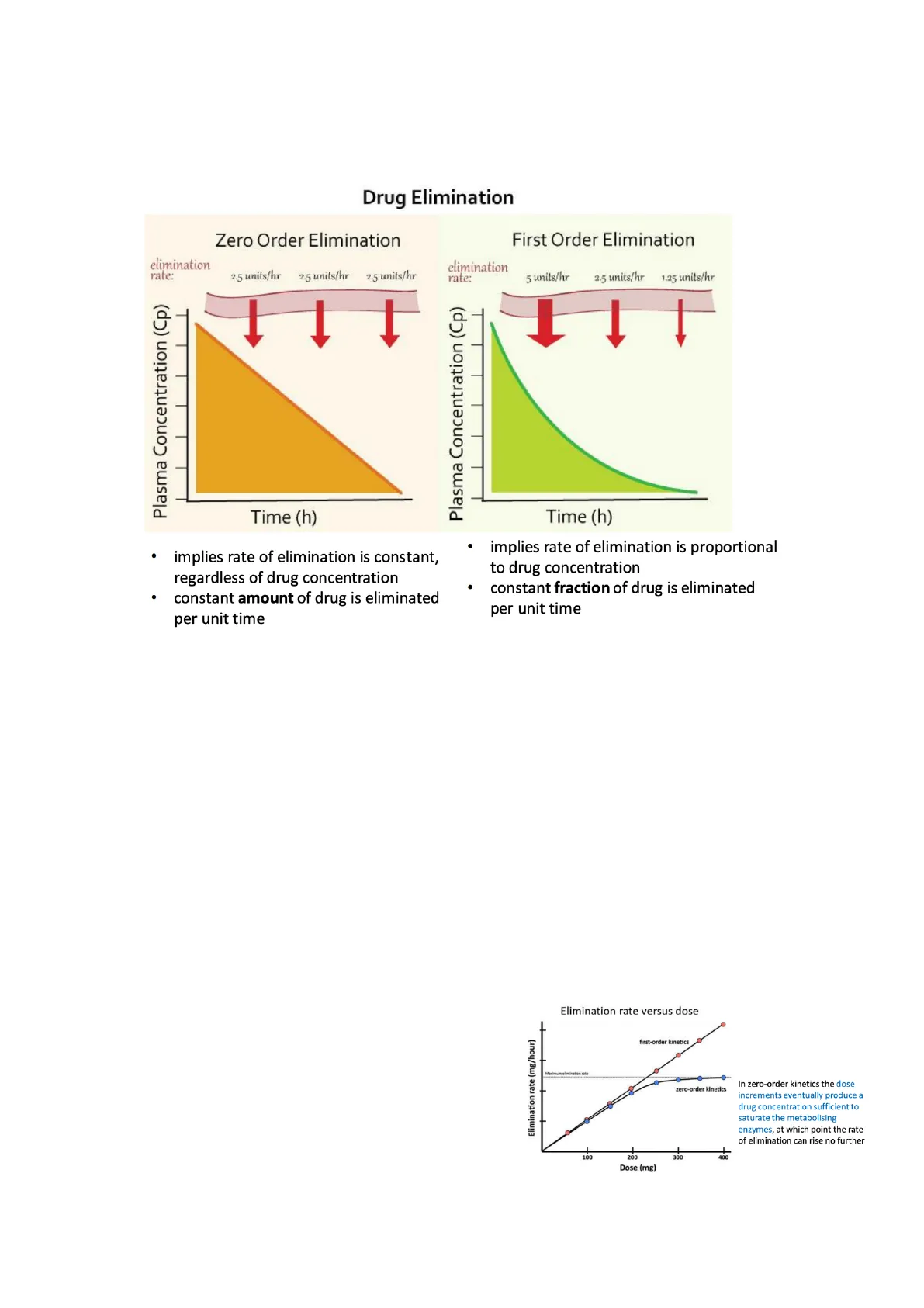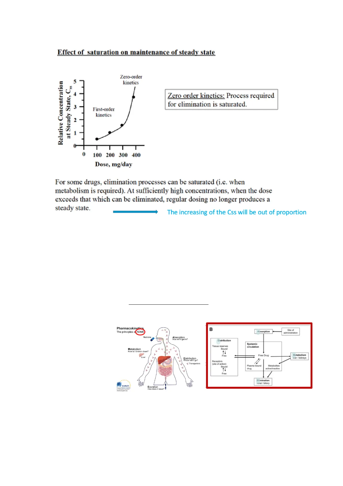 Zero order kinetics: Process required for elimination is saturated. For some drugs, elimination processes can be saturated (i.e. when metabolism is required). At sufficiently high concentrations, when the dose exceeds that which can be eliminated, regular dosing no longer produces a steady state. The increasing of the Css will be out of proportion Css= concentration at the steady state; it is a concentration in the plasma for a drug in which the concentration that enters in the plasma is equal to the concentration that is eliminated from the plasma. The maintaining dose is important to reach a steady state of a drug, especially for administration of a drug for a long time. So, to reach the concentration at the steady state is important because it means that the concentration of the drug is optimal for inducing a response. For drugs eliminated with zero order kinetics, it's very difficult to achieve the Css, because the drug tends to accumulate; on the other hand, for a drug eliminated with first order kinetic it is not a problem, the Css can be easily reached. A drug that follows a zero order kinetic, it is more difficult to manage, because its pharmacokinetic is not linear in relation to the concentration of the drug.
