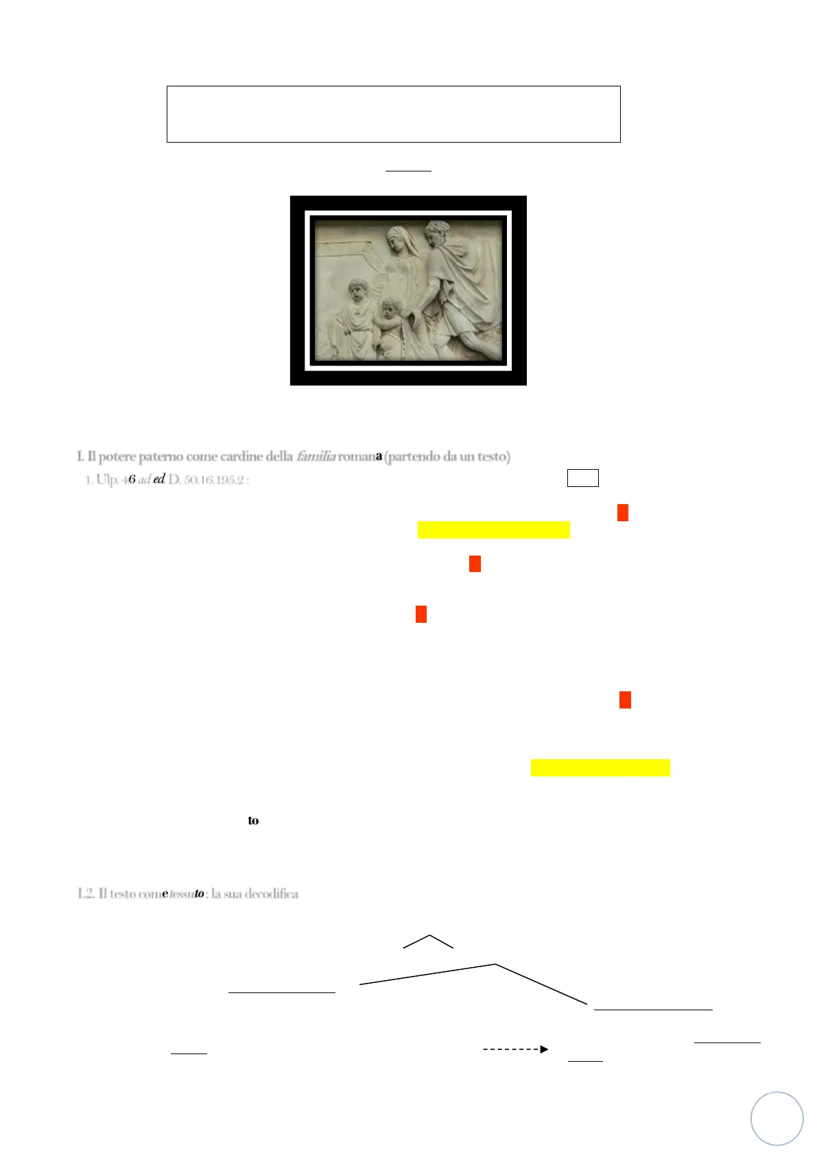Ulp. = Domizio Ulpiano (+ nel 228 d.C .; cfr. Marrone § 25) D. = Digesta Justiniani Augusti (cfr. Marrone § 26) Il termine 'famiglia' riporta anche al significato di 'gruppo organizzato', formato o sul diritto proprio dei componenti o su una generale parentela comune. a Indichiamo come famiglia di proprio diritto' la pluralità di persone che sono sottoposte o per natura o per diritto al potere di uno solo, [1]per es. il padre di famiglia, la madre di famiglia, il figlio di famiglia, la figlia di famiglia e poi coloro che prendono il posto di costoro, per es. i nipoti e le nipoti e via dicendo. Peraltro, 'padre di famiglia' è il nome dato a colui che esercita il dominio nella casa, e viene indicato corret- tamente così, anche qualora non abbia alcun figlio: difatti non indichiamo semplicemente la sua persona, ma pure la sua condizione giuridica: e pertanto anche il pupillo lo chiamiamo padre di famiglia. E quando il padre di famiglia muore, tutti quanti gli individui che gli erano subordinati, cominciano ad avere ciascuno una famiglia: essi passano infatti singolarmente sotto il nome di padri di famiglia. ( ... ) Come famiglia di diritto comune' indichiamo l'insieme di tutti gli agnati: difatti anche se per la morte del padre di famiglia hanno ciascuno una famiglia, tuttavia tutti coloro che furono sotto la potestà di uno solo, correttamente vengono indicati come membri della stessa famiglia, poiché provengono dalla stessa casa e stirpe.