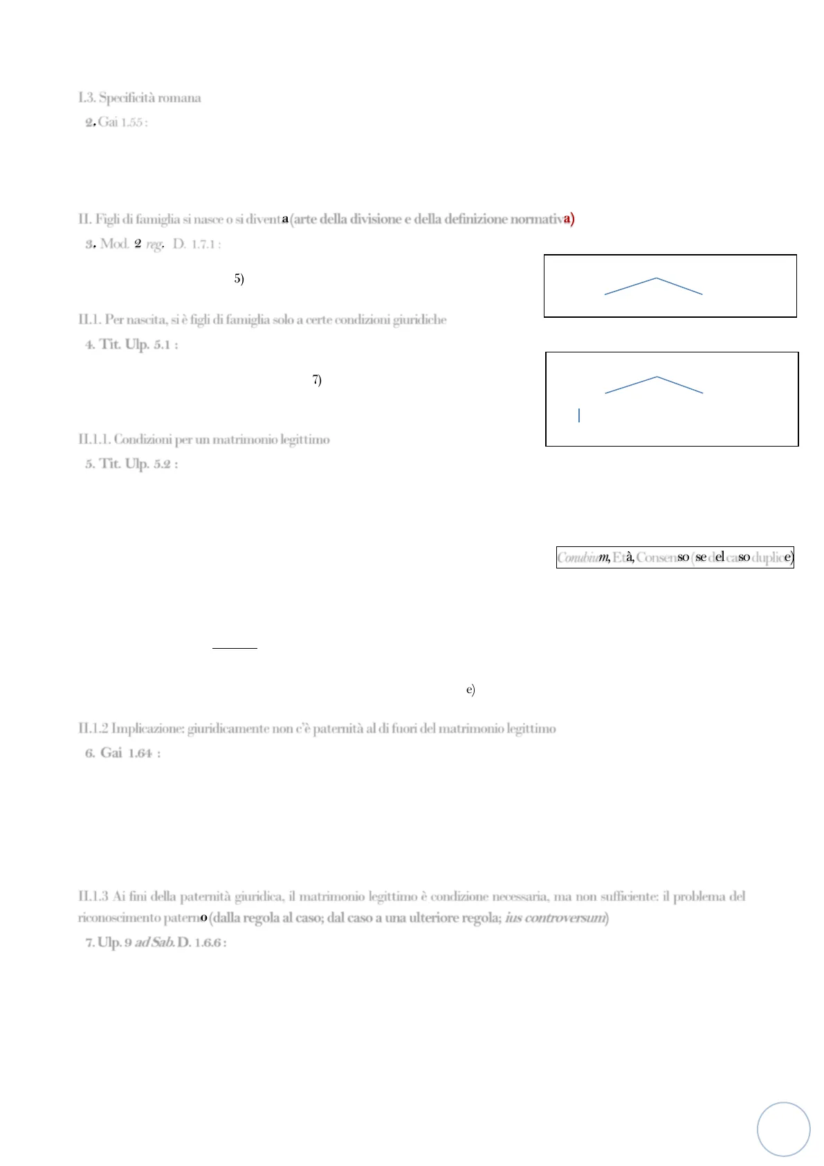 7. Ulp. 9 ad Sab.D. 1.6.6 : Filium eum definimus, qui ex viro et uxore eius nascitur. Sed si fingamus afuisse maritum verbi gratia per decennium, reversum anniculum invenisse in domo sua, placet nobis Iuliani sententia hunc non esse mariti filium. Non tamen ferendum Iulianus ait eum, qui cum uxore sua adsidue moratus nolit filium adgnoscere quasi non suum. Sed mihi videtur, quod et Scaevola probat, si constet maritum aliquamdiu cum uxore non concubuisse infirmitate interveniente vel alia causa, vel si ea valetudine pater familias fuit, ut generare non possit, huic, qui in domo natus est, licet vicinis scientibus, filium non esse. Ulp. = Domizio Ulpiano (; nel 228 d.C .; cfr. Marrone § 25) Scevola = Cervidio Scevola ((+ intorno al 200 d.C .; cfr. Marrone § 25) Giuliano = Salvio Giuliano (attivo nel 130 d.C .; cfr. Marrone §§ 17 e 25) Definiamo 'figlio' colui che nasce da un marito e una moglie. Ma se immaginiamo che il marito fosse assente, magari per dieci anni e che al ritorno si sia trovato in casa un bambino di un anno, concordiamo con l'opinione di Giuliano che costui non è figlio del marito. Giuliano dice tuttavia che non va assecondato colui che rifiuta di riconoscere il figlio come suo, pur avendo dimorato assiduamente con la moglie. A me però sembra - ed anche Scevola è d'accordo - che qualora risulti che il marito per parecchio tempo non si accoppiò con la mo- glie, per una malattia sopravenuta o per altra ragione, oppure anche se il padre di famiglia aveva una malattia tale da non poter generare, la persona che sia nata in casa, nonostante la consapevolezza dei vicini, non gli sia figlio.