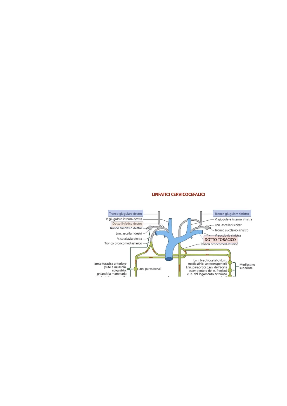LINFATICI CERVICOCEFALICI Tronco giugulare destro Tronco giugulare sinistro V. giugulare interna destra ·V. giugulare interna sinistra Dotto linfatico destro - Lnn. ascellari sinistri Tronco succlavio destro Tronco succlavio sinistro Lnn. ascellari destri V. succlavia sinistra V. succlavia destra Tronco broncomediastinico DOTTO TORACICO Tronco broncomediastinico Parete toracica anteriore (cute e muscoli), epigastrio, Lnn. parasternali Lnn. brachiocefalici (Lnn. mediastinici anterosuperiori) Lnn. paraortici (Lnn. dell'aorta ascendente o del n. frenico) e In. del legamento arterioso Mediastino superiore ghiandola mammaria . .. Così come per i vasi arteriosi e venosi visti fino ad ora, un elemento che si deve considerare è la posizione da un punto di vista stratigrafico. Anche in questo caso possiamo riconoscere una rete di vasi linfatici presente a livello sottocutaneo e quindi costituita da vasi linfatici superficiali, e una rete presente a livello di strutture profonde quindi situata al di sotto della fascia comune del corpo. I vasi linfatici profondi e superficiali sono ampiamente anastomizzati tra di loro. Questo concetto lo si ritrova quindi sia nella componente venosa (vene superficiali e vene profonde), sia nella componente linfatica. Come avviene per i vasi linfatici, anche i linfonodi di questo distretto possono essere superficiali oppure profondi. I linfonodi del distretto di testa e collo sono circa 300 e, considerando che in tutto il corpo ce ne sono circa 800, rappresentano un numero considerevole. Sono caratterizzati da una topografia piuttosto complessa, e la schematizzazione non è semplice. La linfa raccolta nelle regioni di testa e collo attraversa le catene linfonodali profonde, per confluire nei tronchi giugulari destro e sinistro (strutture profonde), per poi essere convogliata nella circolazione venosa. Il tronco giugulare destro confluisce poi nel dotto linfatico destro, che si inserisce tra la vena giugulare interna e la vena succlavia destra. Il dotto giugulare sinistro confluisce nel dotto toracico che 38raggiunge il punto di confluenza tra la vena giugulare interna e la vena succlavia sinistra. Il punto di confluenza dei vasi linfatici è quindi a livello del comparto venoso.