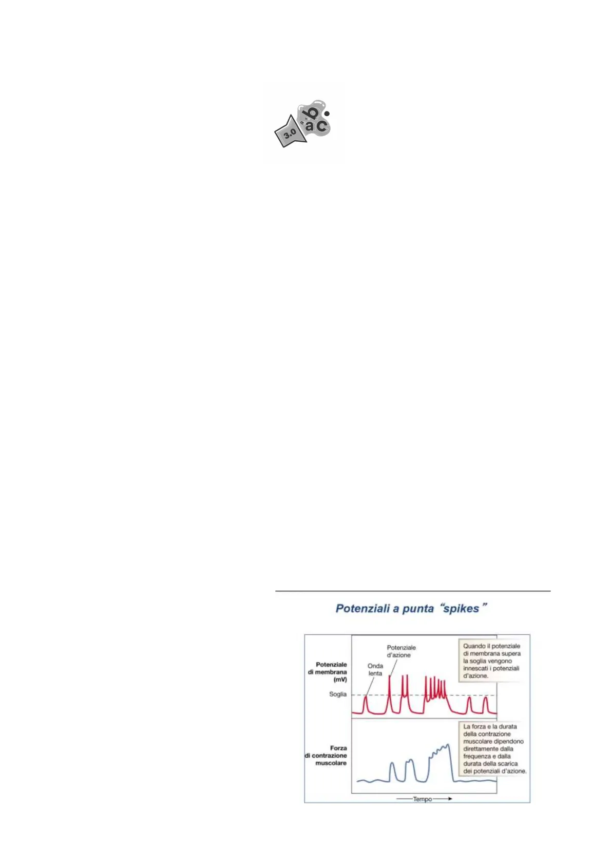 Quindi quando ci sono queste onde lente non si raggiunge il valore soglia e quindi non si ha potenziale d'azione, tuttavia se l'onda lenta arriva nel momento in cui ci sono delle stimolazioni della zona considerata, che quindi è stata eccitata per il rilascio dell'acetilcolina o di ormoni, si riesce a superare il valore soglia e si genera un potenziale d'azione e quindi la contrazione. Questi potenziali sono più lunghi di quelli delle fibre nervose, perché anziché essere dovuti alla mobilitazione degli ioni sodio, si ha un movimento degli ioni calcio.