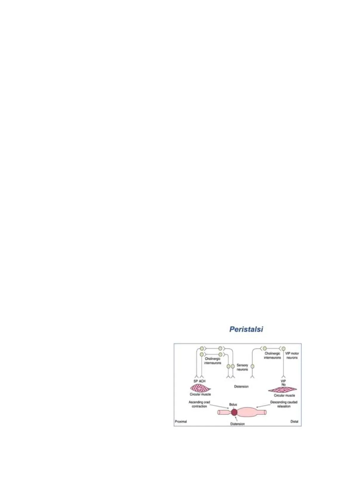 La peristalsi è un riflesso intrinseco locale. Nel momento in cui nel canale digerente c'è del materiale vengono attivati dei meccanocettori che, tramite dei neuroni afferenti, mandano informazioni a degli inter-neuroni, questi rilasciano a monte dei neurotrasmettitori con attività contrattile; a valle l'accoppiamento di neuroni sensoriali con degli inter-neuroni porta al rilascio di mediatori come TIF che determinano un rilasciamento.