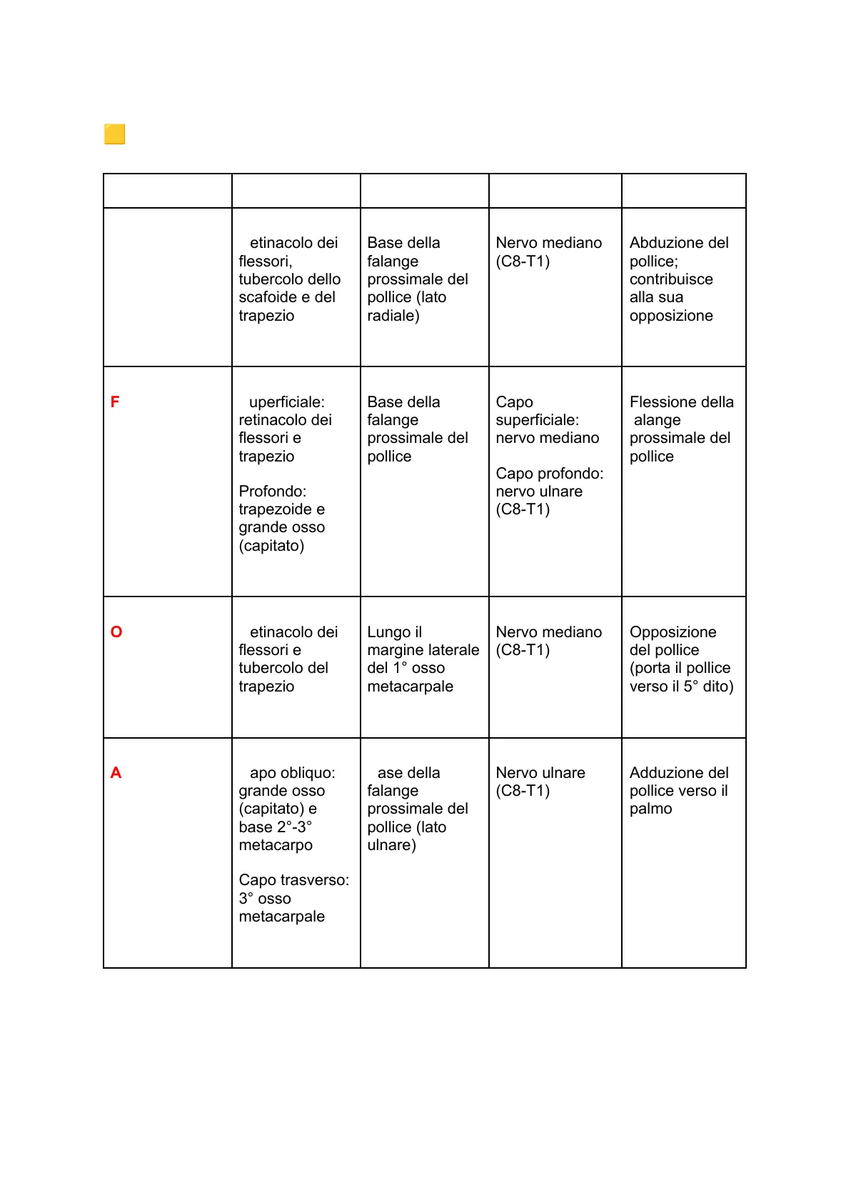 Opponente del pollice Retinacolo dei flessori e tubercolo del trapezio Lungo il margine laterale del 1º osso metacarpale Nervo mediano (C8-T1) Opposizione del pollice (porta il pollice verso il 5° dito)