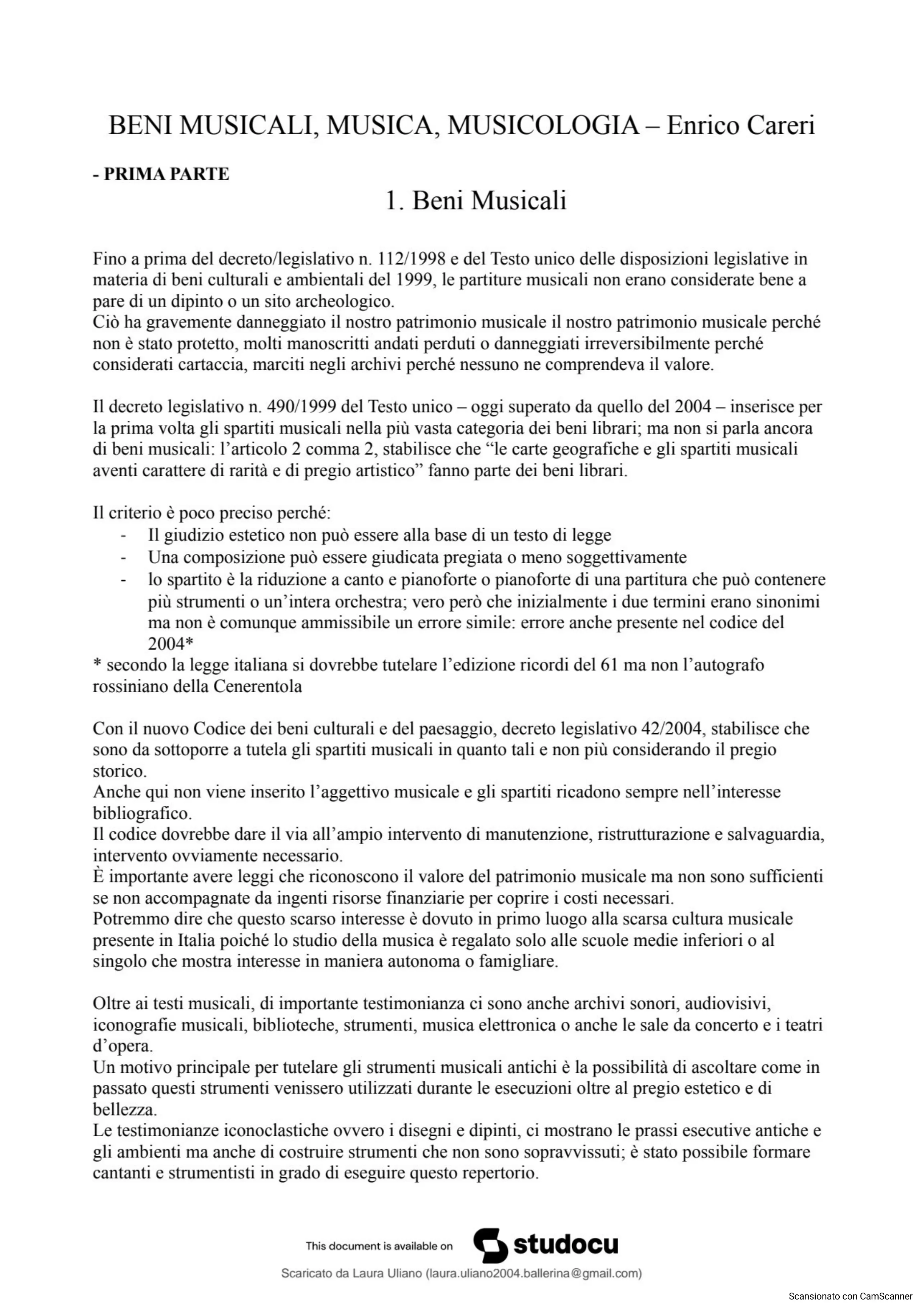 * secondo la legge italiana si dovrebbe tutelare l'edizione ricordi del 61 ma non l'autografo rossiniano della Cenerentola Con il nuovo Codice dei beni culturali e del paesaggio, decreto legislativo 42/2004, stabilisce che sono da sottoporre a tutela gli spartiti musicali in quanto tali e non più considerando il pregio storico. Anche qui non viene inserito l'aggettivo musicale e gli spartiti ricadono sempre nell'interesse bibliografico. Il codice dovrebbe dare il via all'ampio intervento di manutenzione, ristrutturazione e salvaguardia, intervento ovviamente necessario. È importante avere leggi che riconoscono il valore del patrimonio musicale ma non sono sufficienti se non accompagnate da ingenti risorse finanziarie per coprire i costi necessari. Potremmo dire che questo scarso interesse è dovuto in primo luogo alla scarsa cultura musicale presente in Italia poiché lo studio della musica è regalato solo alle scuole medie inferiori o al singolo che mostra interesse in maniera autonoma o famigliare. Oltre ai testi musicali, di importante testimonianza ci sono anche archivi sonori, audiovisivi, iconografie musicali, biblioteche, strumenti, musica elettronica o anche le sale da concerto e i teatri d'opera. Un motivo principale per tutelare gli strumenti musicali antichi è la possibilità di ascoltare come in passato questi strumenti venissero utilizzati durante le esecuzioni oltre al pregio estetico e di bellezza. Le testimonianze iconoclastiche ovvero i disegni e dipinti, ci mostrano le prassi esecutive antiche e gli ambienti ma anche di costruire strumenti che non sono sopravvissuti; è stato possibile formare cantanti e strumentisti in grado di eseguire questo repertorio. Fino alla fine del XVIII sec la musica si era posta all'ultimo grado nella gerarchia delle arti perché considerata inespressiva a differenza di poesie o quadri. I compositori, i musicisti a pari di un falegname quindi lontanissimi sulla gerarchia sociale da un poeta o un pittore. Nel XIX sec invece con Beethoven si ha un capovolgimento delle considerazioni: la musica diventa la prima arte che da sola riesce ad esprimere l'infinito; arrivando alla considerazione del compositore come un genio. Ciò avvenne in Germania dove si svilupparono i primi generi strumentali perfetti per esprimere la concezione romantica. In Italia però le arti figurative e letterarie non vengono messe in discussione rimanendo socialmente considerate più auliche a differenza della musica che invece era rimasta "un bel gioco" sostanzialmente inutile. Forse ciò ha contribuito a lasciare la musica fuori dai programmi scolastici se non a pagamento nei collegi o come hobby aristocratico. Non è necessario essere musicisti o musicalmente alfabetizzati per provare piacere all'ascolto di un qualsiasi compositore ma bisogna avere un'adeguata educazione all'ascolto critico perché la musica si deve ascoltare e non sentire. La musica comunque è stata ed è ancora oggi presente in maniera costante nelle nostre vite specialmente allo sfruttamento commerciale della musica per vendere e quindi appare ancora più grave che questo bisogno sia soddisfatto solo dalla musica di consumo prodotta solo per fare cassa.