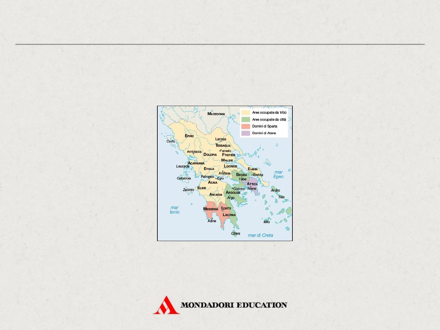 La penisola greca era suddivisa in numerose città-stato, ciascuna delle quali controllava un territorio limitato. Tra VII e V sec. a.C. emersero Sparta e Atene