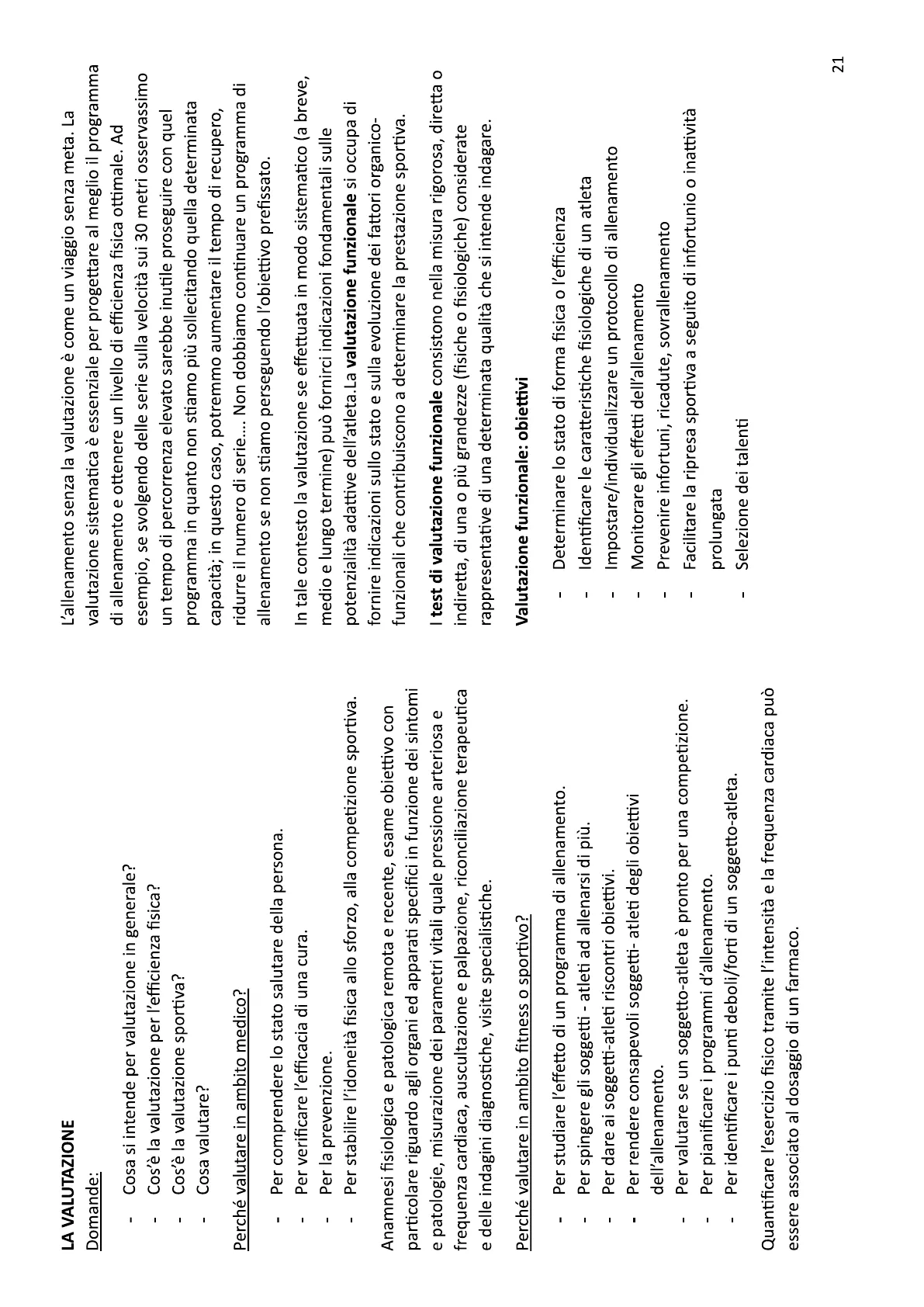 1 Per identificare i punti deboli/forti di un soggetto-atleta. Quantificare l'esercizio fisico tramite l'intensità e la frequenza cardiaca può essere associato al dosaggio di un farmaco. L'allenamento senza la valutazione è come un viaggio senza meta. La valutazione sistematica è essenziale per progettare al meglio il programma di allenamento e ottenere un livello di efficienza fisica ottimale. Ad esempio, se svolgendo delle serie sulla velocità sui 30 metri osservassimo un tempo di percorrenza elevato sarebbe inutile proseguire con quel programma in quanto non stiamo più sollecitando quella determinata capacità; in questo caso, potremmo aumentare il tempo di recupero, ridurre il numero di serie .... Non dobbiamo continuare un programma di allenamento se non stiamo perseguendo l'obiettivo prefissato. In tale contesto la valutazione se effettuata in modo sistematico (a breve, medio e lungo termine) può fornirci indicazioni fondamentali sulle potenzialità adattive dell'atleta.La valutazione funzionale si occupa di fornire indicazioni sullo stato e sulla evoluzione dei fattori organico- funzionali che contribuiscono a determinare la prestazione sportiva. I test di valutazione funzionale consistono nella misura rigorosa, diretta o indiretta, di una o più grandezze (fisiche o fisiologiche) considerate rappresentative di una determinata qualità che si intende indagare.
