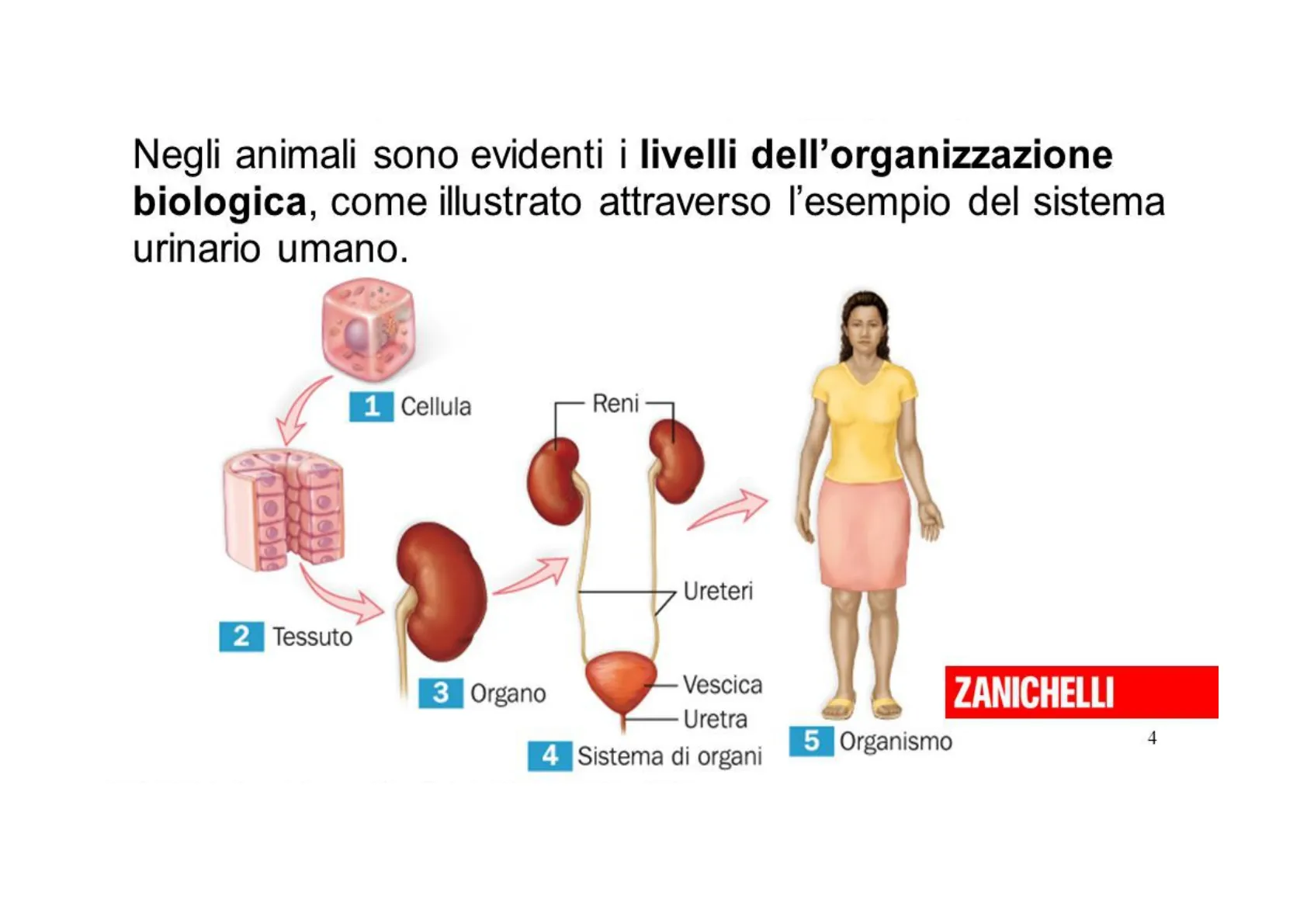 CORPO UMANO: DIVERSI LIVELLI DI GERARCHIA STRUTTURALE atomi -> molecole -> cellule -> tessuti -> organi -> apparati e sistemi -> organismoNegli animali sono evidenti i livelli dell'organizzazione biologica, come illustrato attraverso l'esempio del sistema urinario umano.