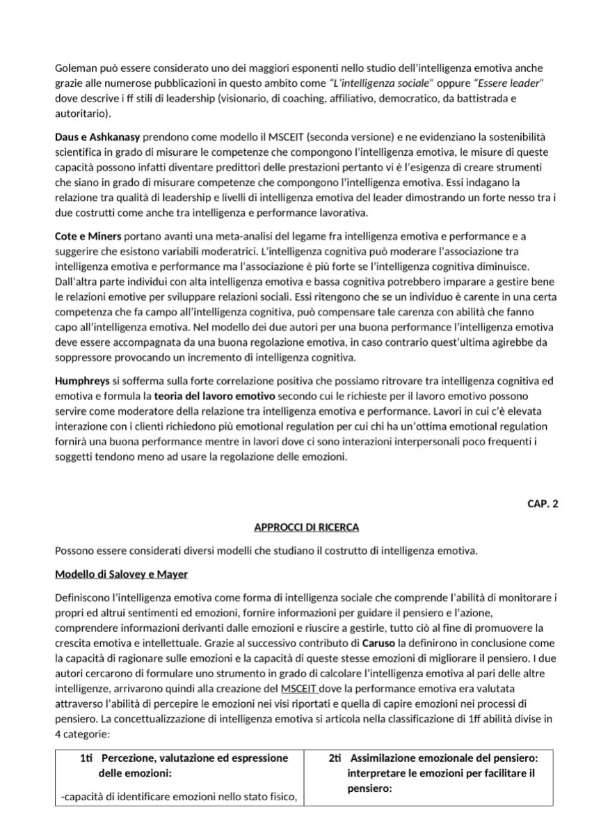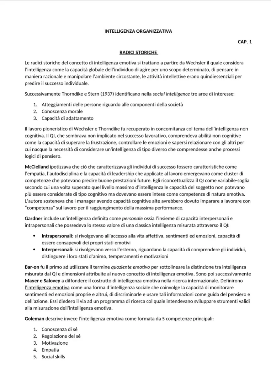 Documento di Università su Intelligenza Organizzativa. Il Pdf, utile per lo studio della Psicologia, esplora l'intelligenza emotiva e organizzativa, tracciandone le radici storiche e gli approcci di ricerca, con contributi di autori come Goleman, Salovey e Mayer.