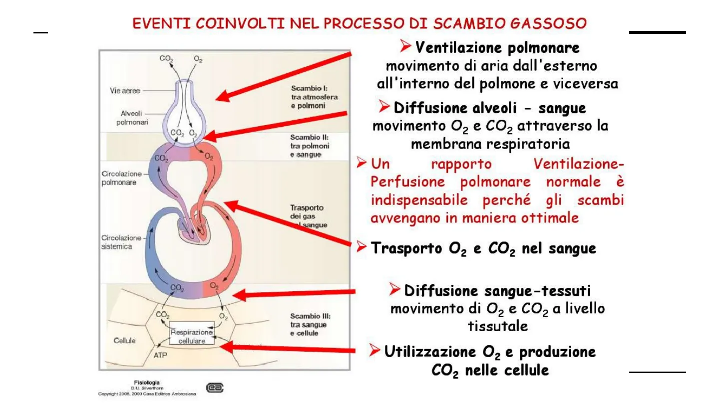 CO 02 Vie aeree Scambio I: tra atmosfera e polmoni Alveoli polmonari CO2 O2 Scambio II: tra polmoni e sangue On CO2 Circolazione polmonare Trasporto dei gas IL sangue Circolazione sistemica CO2 CO2 02 Scambio III: tra sangue e cellule Cellule Respirazione cellulare ATP Fisiologia D.L. Silverthorn Copyright 2005, 2000 Casa Editrice Ambrosiana ea