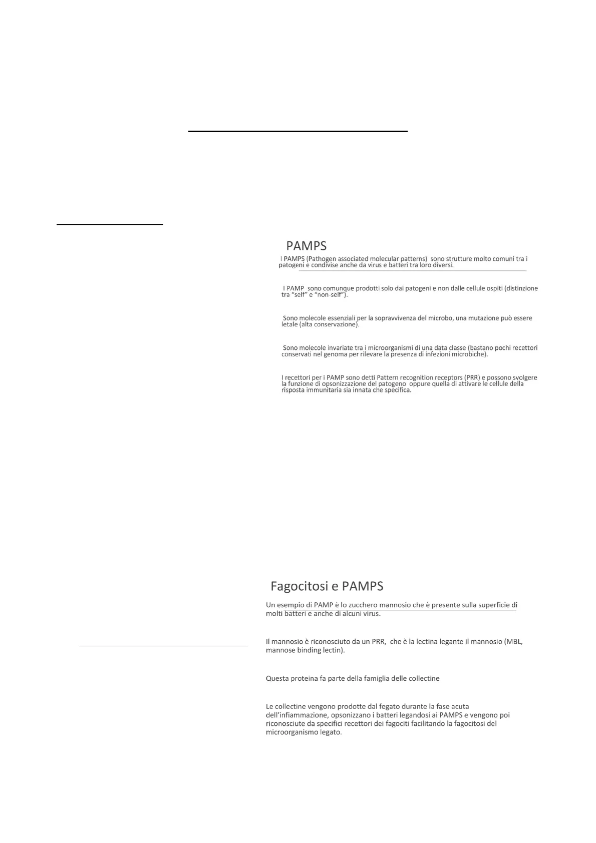 I PAMPS (Pathogen associated molecular patterns) sono strutture molto comuni tra i patogeni e condivise anche da virus e batteri tra loro diversi. I PAMP sono comunque prodotti solo dai patogeni e non dalle cellule ospiti (distinzione tra "self" e "non-self"). Sono molecole essenziali per la sopravvivenza del microbo, una mutazione può essere letale (alta conservazione). Sono molecole invariate tra i microorganismi di una data classe (bastano pochi recettori conservati nel genoma per rilevare la presenza di infezioni microbiche). I recettori per i PAMP sono detti Pattern recognition receptors (PRR) e possono svolgere la funzione di opsonizzazione del patogeno oppure quella di attivare le cellule della risposta immunitaria sia innata che specifica. Un esempio di PAMP è l'LPS prodotto dai Gram -, il quale è importante per la loro parete ed è un lipide che noi non esprimiamo, quindi il recettore che riconosce l'LPS ci permette di capire se è in corso un'infezione da Gram -. Ci sono tanti PAMPs e recettori diversi che hanno funzioni differenti tra loro. I PAMP sono molecole conservate nel patogeno e che possono essere riconosciute dai recettori. A seconda del PAMP e del recettore che lo riconosce mediano funzioni differenti. I PAMPs sono molecole importanti, invariate tra i microrganismi di una data classe e questo comporta che bastano pochi recettori conservati per rilevare la presenza di questi microbi. Quindi riconoscono tutti cose simili (PAMPs) ma fanno cose molto diverse (opsonina/fagocitosi ... ) .