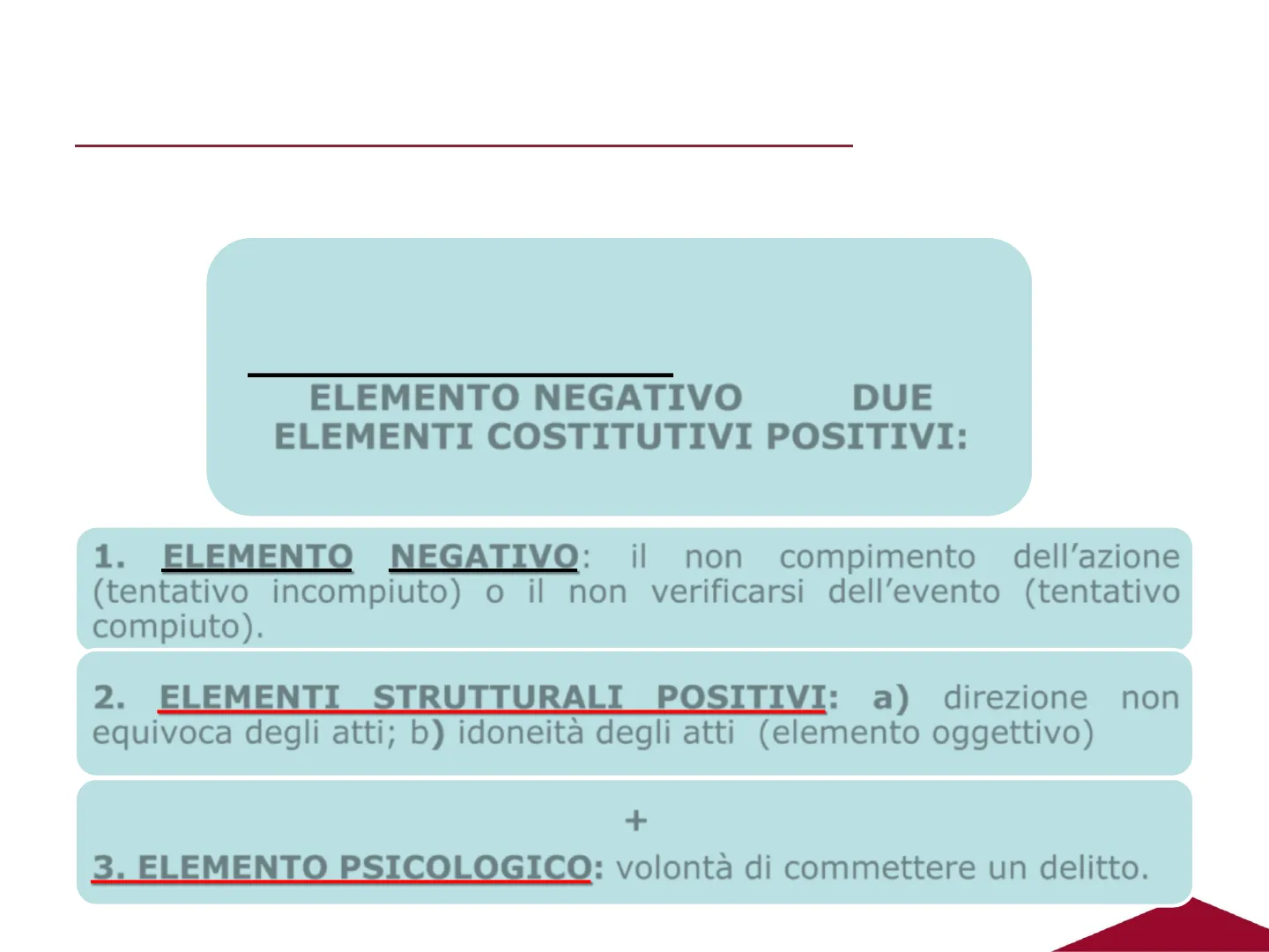 UNITELMA SAPIENZA Prof. Vincenzo Mongillo IL DELITTO TENTATO (SECONDA PARTE)STRUTTURA DEL DELITTO TENTATO IL DELITTO TENTATO, SOTTO IL PROFILO OGGETTIVO, CONSTA DI UN ELEMENTO NEGATIVO E DI DUE ELEMENTI COSTITUTIVI POSITIVI: