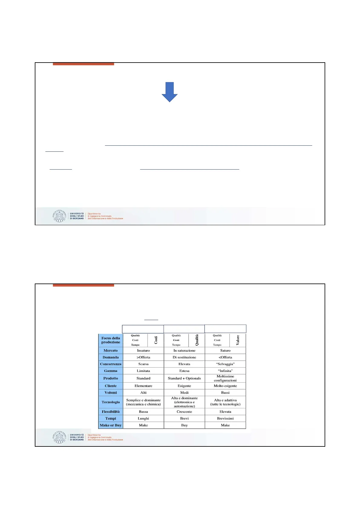 Fino agli anni '70 Anni '80-'90 dagli anni '00 Focus della produzione Qualità Costi Tempo Costi Qualità Costi Qualità Qualità Costi Valore Tempo Tempo Mercato Insaturo In saturazione Saturo Domanda >Offerta Di sostituzione