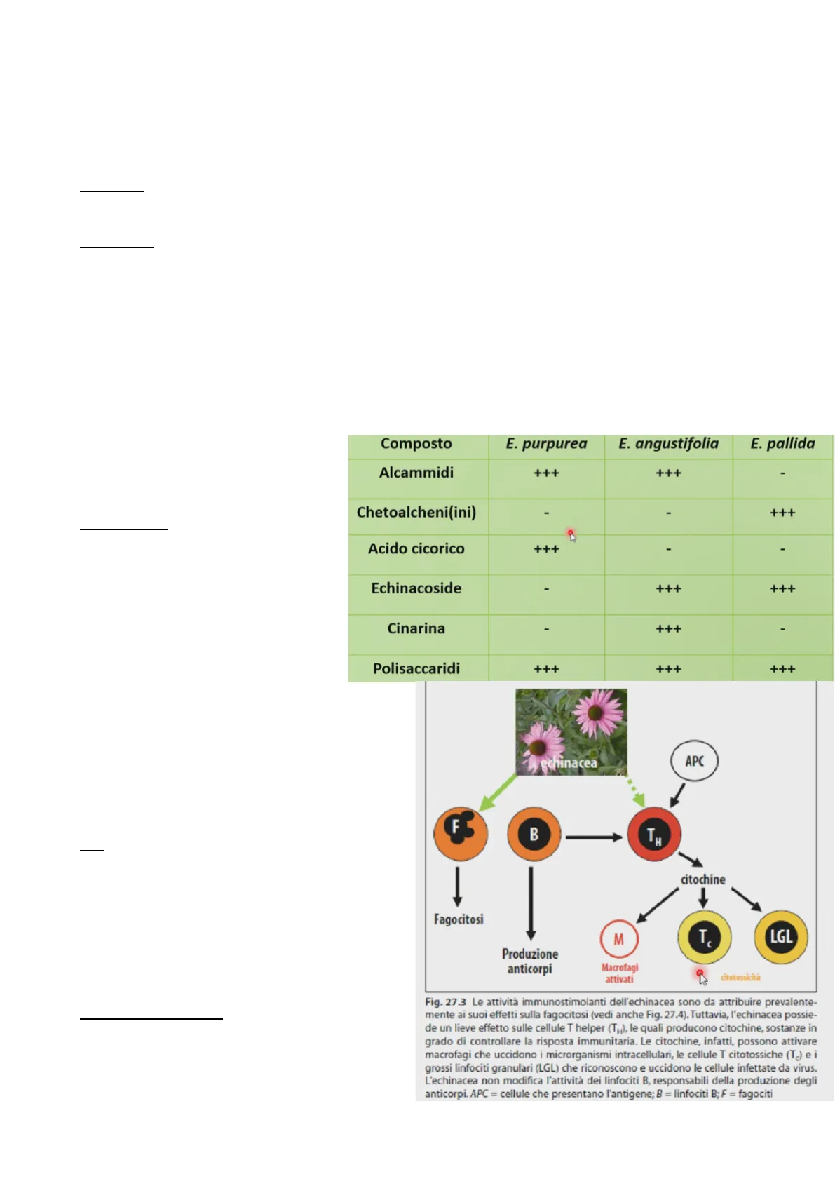 Composto E. purpurea E. angustifolia E. pallida Alcammidi +++ - Chetoalcheni(ini) - - Acido cicorico - - Echinacoside - +++ +++ Cinarina - +++ - Polisaccaridi ++++ ++++ +++ Wechinacea APC F B TH citochine Fagocitosi M T. LGL Produzione anticorpi Macrofagi attivati citotossicità Fig. 27.3 Le attività immunostimolanti dell'echinacea sono da attribuire prevalente- mente ai suoi effetti sulla fagocitosi (vedi anche Fig. 27.4). Tuttavia, l'echinacea possie- de un lieve effetto sulle cellule T helper (TH), le quali producono citochine, sostanze in grado di controllare la risposta immunitaria. Le citochine, infatti, possono attivare macrofagi che uccidono i microrganismi intracellulari, le cellule T citotossiche (TO) e i grossi linfociti granulari (LGL) che riconoscono e uccidono le cellule infettate da virus. L'echinacea non modifica l'attività dei linfociti B, responsabili della produzione degli anticorpi. APC = cellule che presentano l'antigene; B = linfociti B; F = fagocitiATTIVITÀ IMMUNOSTIMOLANTE: basi farmacologiche