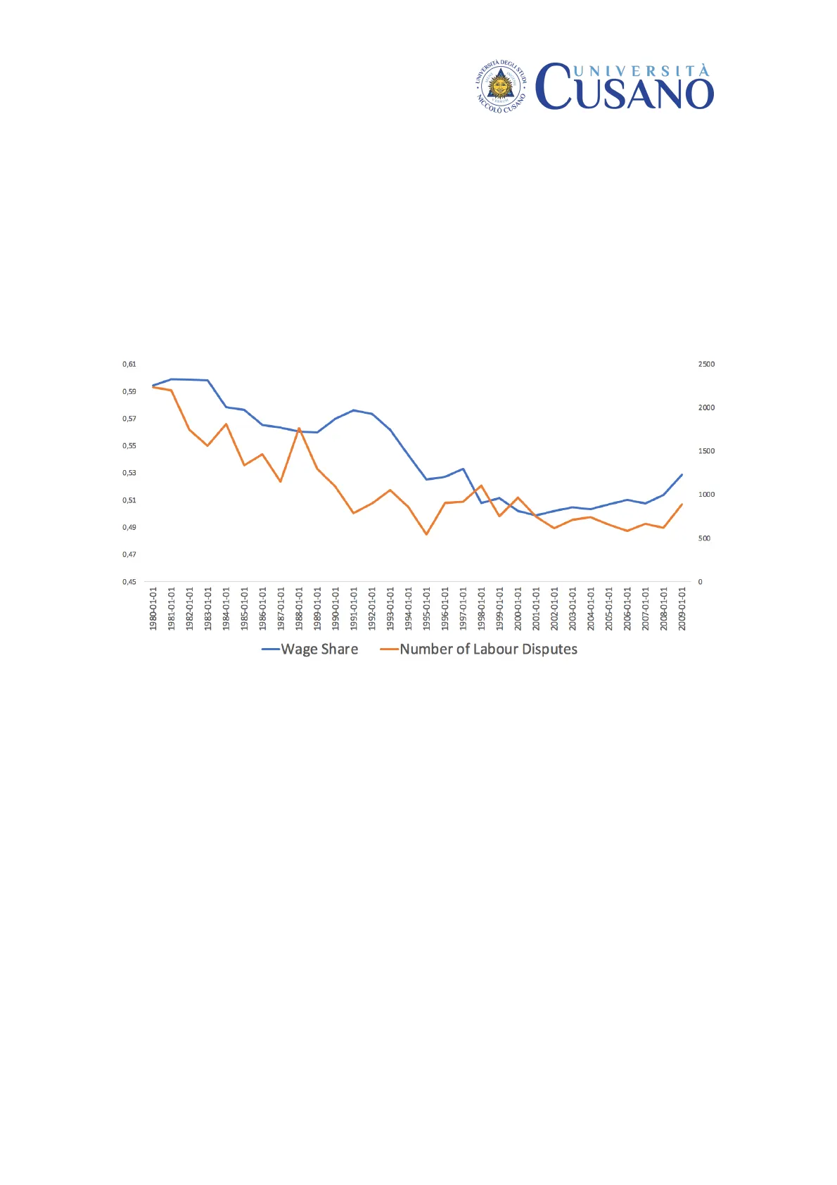0,61 2500 0,59 2000 0,57 0,55 1500 0,53 1000 0,51 0,49 500 0,47 0,45 0 1980-01-01 1981-01-01 1982-01-01 1983-01-01 1984-01-01 1985-01-01 1986-01-01 1987-01-01 1988-01-01 1989-01-01 1990-01-01 1991-01-01 1992-01-01 1993-01-01 1994-01-01 1995-01-01 1996-01-01 1997-01-01 1998-01-01 1999-01-01 2000-01-01 2001-01-01 2002-01-01 2003-01-01 2004-01-01 2005-01-01 2006-01-01 2007-01-01 2008-01-01 2009-01-01 -Wage Share -Number of Labour Disputes