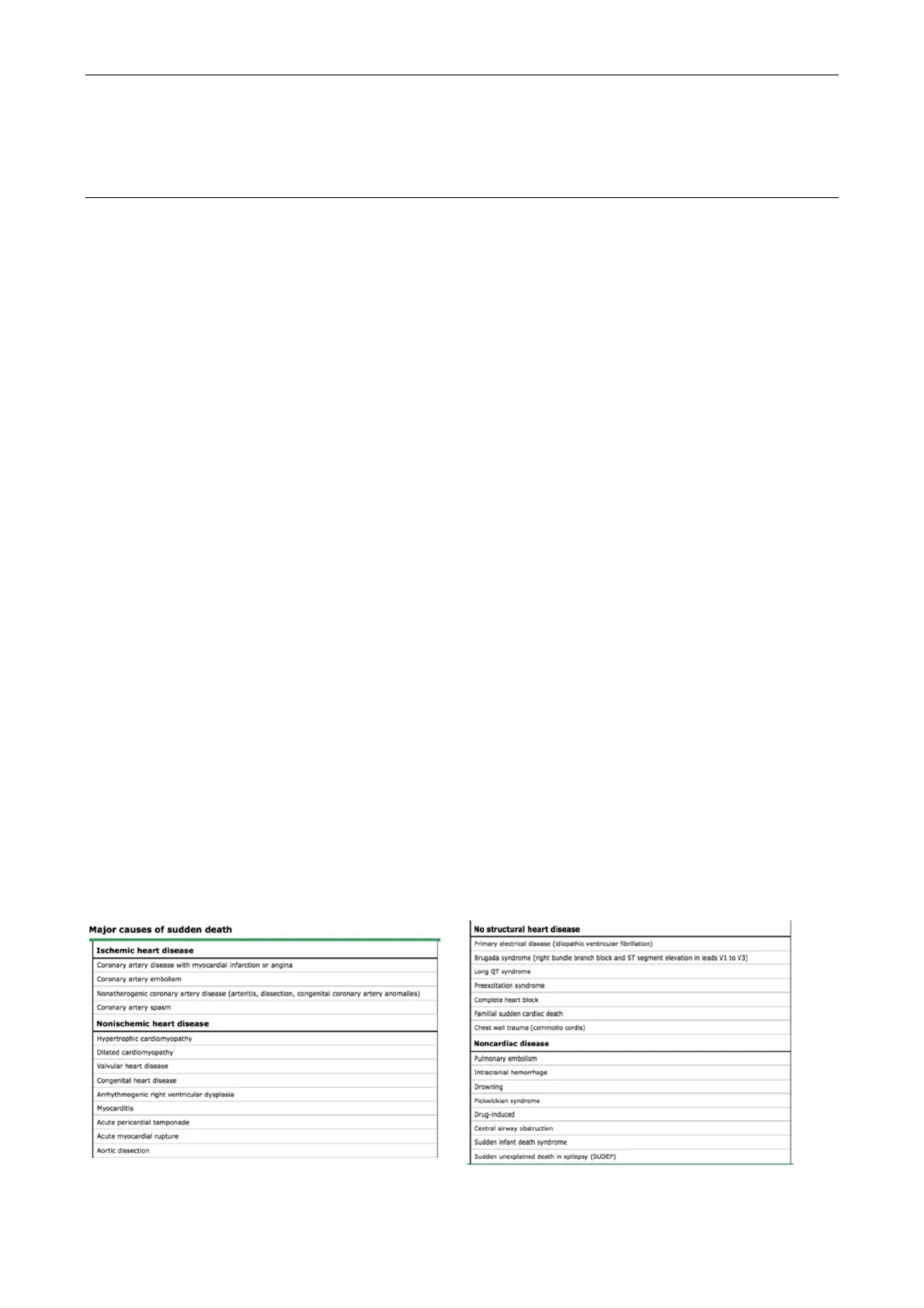 Major causes of sudden death Ischemic heart disease Coronary artery disease with myocardial infarction or angina Coronary artery embolism Nonatherogenic coronary artery disease (arteritis, dissection, congenital coronary artery anomalies) Coronary artery spasm Nonischemic heart disease Hypertrophic cardiomyopathy Dilated cardiomyopathy Valvular heart disease Congenital heart disease Arrhythmogenic right ventricular dysplasia Myocarditis Acute pericardial tamponade Acute myocardial rupture Aortic dissection No structural heart disease Primary electrical disease (idiopathic ventricular fibrillation) Brugada syndrome (right bundle branch block and ST segment elevation in leads V1 to V3) Long QT syndrome Preexcitation syndrome Complete heart block Familial sudden cardiac death Chest wall trauma (commotio cordis) Noncardiac disease Pulmonary embolism Intracranial hemorrhage Drowning Pickwickian syndrome Drug-induced Central airway obstruction Sudden infant death syndrome Sudden unexplained death in epilepsy (SUDEP)Medicina legale #14 - Prof. Bailo - Morte improvvisa e lesività Pag. 2 a 18