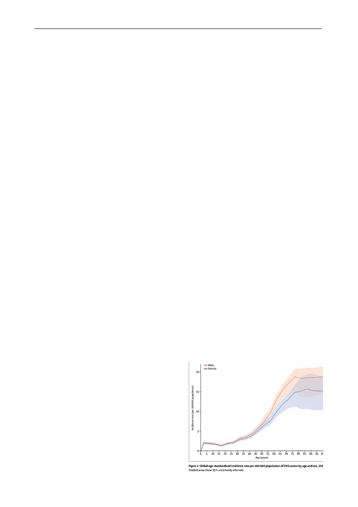 Nell'immagine a destra si può osservare una curva di incidenza divisa per fasce di età (al prof. le incidenze risultano un po' troppo alte). Si può Male -Female notare che esiste una certa incidenza anche nella 20- prima e nella seconda decade di età. Le curve diventano più ripide con l'aumentare dell'età. 15 Si raggiunge il picco massimo di incidenza attorno all'ottava-nona decade di vita, in cui si registrano anche tumori più aggressivi e mortiferi. Gli uomini sono più colpiti da questo tipo di tumori rispetto alle donne. In generale l'incidenza cumulativa dei tumori cerebrali varia nelle fasce d'età tra i 10 e i 15 casi ogni 100.000 abitanti. Incidence rate (per 100000 population) 10 5- 0- 0 5 10 15 20 25 30 35 40 45 50 55 60 65 70 75 80 85 90 95 10 Age (years) Figure 2: Global age-standardised incidence rate per 100 000 population of CNS cancer by age and sex, 201 Shaded areas show 95% uncertainty intervals.Anatomia Patologica #1 - Biagio Eugenio Leone - Neuropatologia: tumori cerebrali, prima parte. Pag. 3 a 17 Nell'immagine a destra si può osservare che dal 1995 al 2002, anche osservando le singole fasce di età, non si sono viste delle grandi variazioni di incidenza dei tumori cerebrali, nonostante le possibilità diagnostiche siano nettamente migliori. 14.00 12.00 European population standard rate 10.00 00-19 years 8.00 -20-39 years -40-59 years 6.00 -- 60 + years -- All 4.00 2.00 0.00 1995 1996 1997 1998 1999 2000 2001 2002 Fig. 1. Glioma incidence trend by age groups.