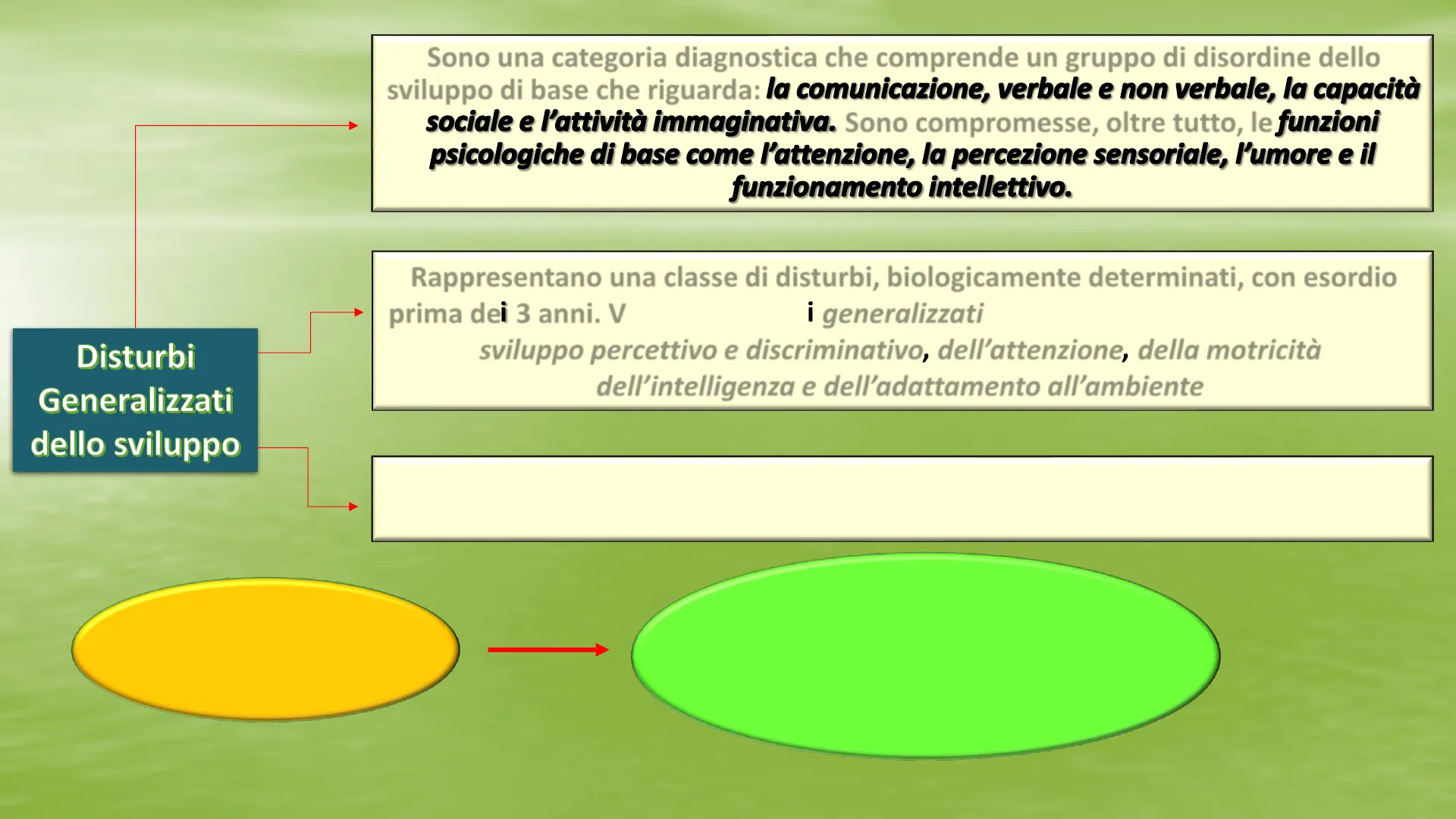 TFA24 - IX CICLO - DISTURBI GENERALIZZATI DELLO SVILUPPO - DISTURBI DEL NEUROSVILUPPO - GIG24 1Sono una categoria diagnostica che comprende un gruppo di disordine dello sviluppo di base che riguarda: la comunicazione, verbale e non verbale, la capacità sociale e l'attività immaginativa. Sono compromesse, oltre tutto, le funzioni psicologiche di base come l'attenzione, la percezione sensoriale, l'umore e il funzionamento intellettivo. Rappresentano una classe di disturbi, biologicamente determinati, con esordio prima dei 3 anni. Vengono definiti generalizzati in quanto ad essere colpiti sono lo sviluppo percettivo e discriminativo, dell'attenzione, della motricità, dell'intelligenza e dell'adattamento all'ambiente.
