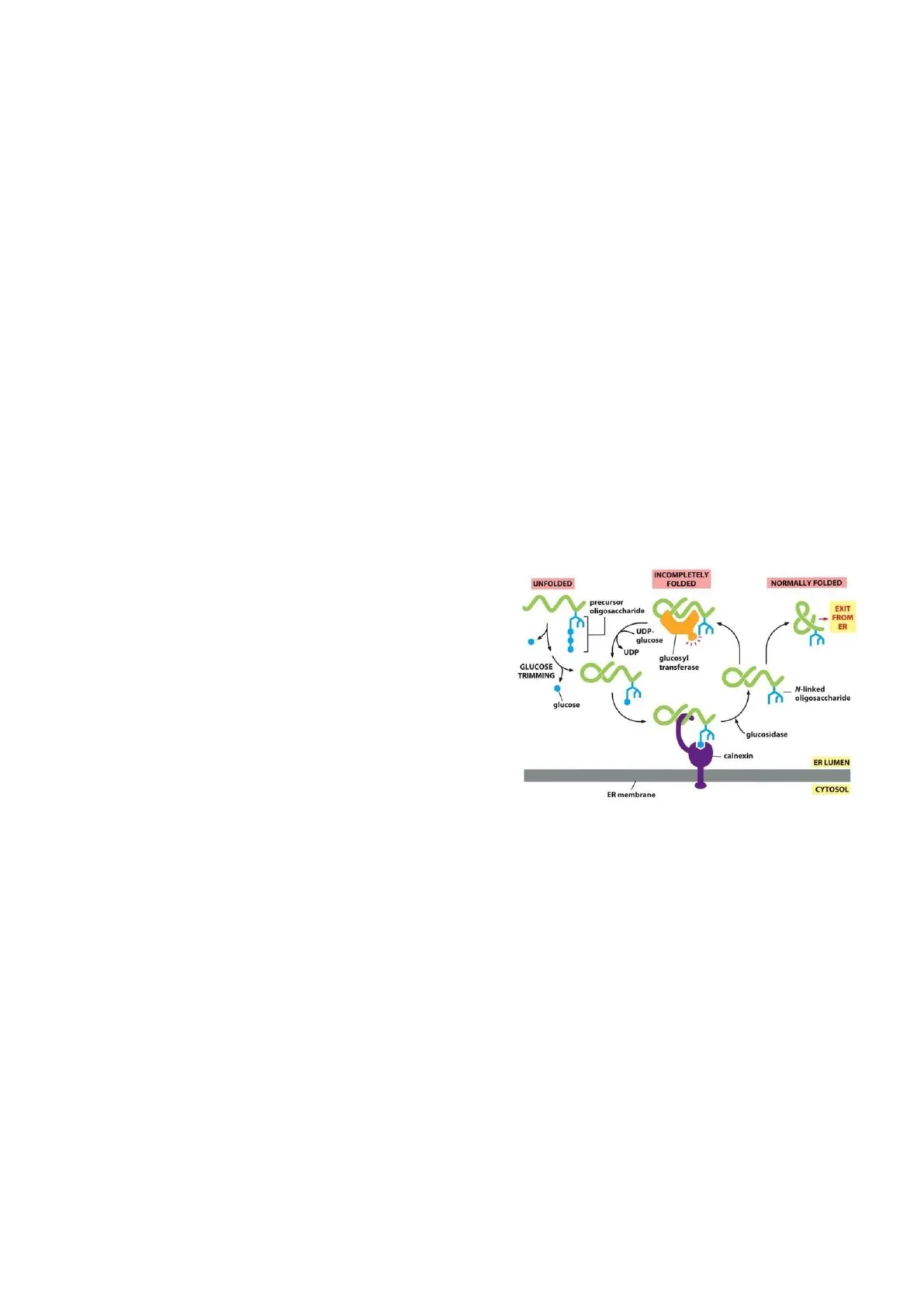 Se invece è mal ripiegata, subentra un altro enzima, il glucosil-trasferasi, che trasferisce un glucosio: questa proteina trasferisce un glucosio solo alle proteine mal ripiegate, perché quella catena oligosaccaridica è più accessibile e riconosce regioni della proteina che non dovrebbero essere esposte. L'aggiunta di questo glucosio forma uno stato intermedio della proteina ancora non ben ripiegata, che avrà questo però un glucosio legato, così che possa essere riconosciuto da Calnexina, e Calreticulina.