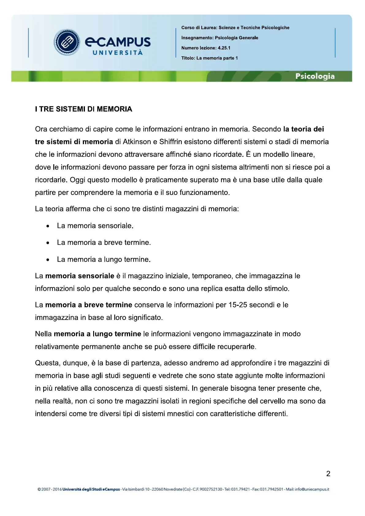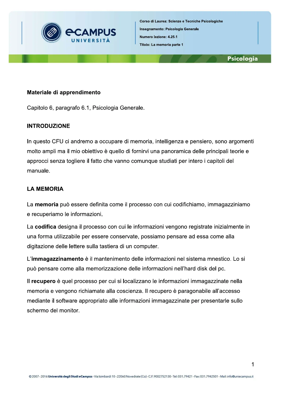 Corso di Laurea: Scienze e Tecniche Psicologiche Insegnamento: Psicologia Generale Numero lezione: 4.25.1 Titolo: La memoria parte 1 Psicologia