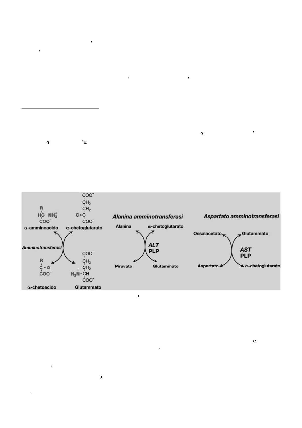 Le transaminasi sono specifiche per ogni proteina e a-chetoacido, e le più conosciute solo la alanina aminotransferasi (GPT) e la aspartato aminotransferasi (GOT). Le transaminasi sono normalmente presenti in tracce a livello ematico; per questo, elevati livelli di GOT (AST) sono indice di lesione miocardica, mentre elevati livelli di GPT (ALT) sono indice di lesione epatica (le transaminasi si ritrovano nel sangue per rottura cellulare). Prolina, lisina, e treonina non sono suscettibili a reazioni di transaminazione. La transaminazione è spesso accoppiata alla deaminazione ossidativa: la presenza del gruppo NH2 in a impedisce agli aminoacidi di subire la degradazione ossidativa, per cui l'eliminazione del gruppo amminico è fondamentale.