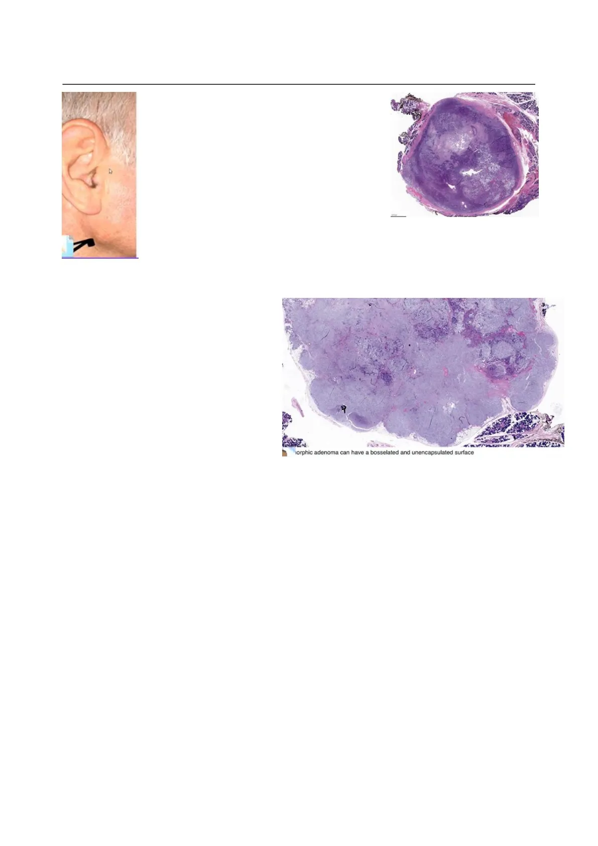 È il tumore più comune delle ghiandole salivari. Di solito appare nelle donne di mezza età. Si verificano più spesso nelle ghiandole parotidi, perché essendo più grandi è più facile trovare tumori al loro interno. Nell'immagine a sinistra possiamo vedere un grande rigonfiamento sulla ghiandola parotide inferiore all'orecchio.Machine Translated by Google Anatomia Patologica#25.2 - Prof. Alò - Tumori della ghiandola salivare Pagina 2 di 9 Nell'immagine centrale si vede il tumore asportato: la zona più bianca è la massa tumorale, ed è facilmente riconoscibile dal parenchima sano della parotide; il fatto che sia incapsulato e facilmente riconoscibile è caratteristico di un tumore benigno. In questo tipo di tumore, possiamo avere diversi tipi di cellule, ma tutte le cellule avranno caratteristiche di benignità, quindi un rapporto preservato tra nucleo, citoplasma e organelli, nessuna distorsione o cicatrice della membrana nucleare, ecc. , l'attività mitotica viene ridotta e viene conteggiata come il numero di cicli mitotici in un campo ad alta potenza. Se troviamo un basso numero di attività mitotiche, è anche un indicatore di benignità. La presenza di nucleoli vacuolati, citologia blanda, piccoli nucleoli, strutture simili a condotti, sono tutti caratteristici dell'adenoma pleomorfo. Allo stesso modo, troviamo le cellule mioepiteliali In questa immagine possiamo vedere la spinta bordi, bordi arrotondati e nella parte inferiore nella parte sinistra e destra dell'immagine noi può identificare la presenza di una salivare normale ghiandola. Possiamo anche vedere la presenza di diversi colori: rosa, viola, viola chiaro e questi i colori significano che ci sono celle diverse, che si differenzieranno rispetto alla condizione iniziale, ma saranno sempre benigni. 9 orphic adenoma can have a bosselated and unencapsulated surface -Superficie esterna bugnata, spesso con sporgenze simili a lingue (pseudopodi). Tipicamente ha i seguenti componenti: