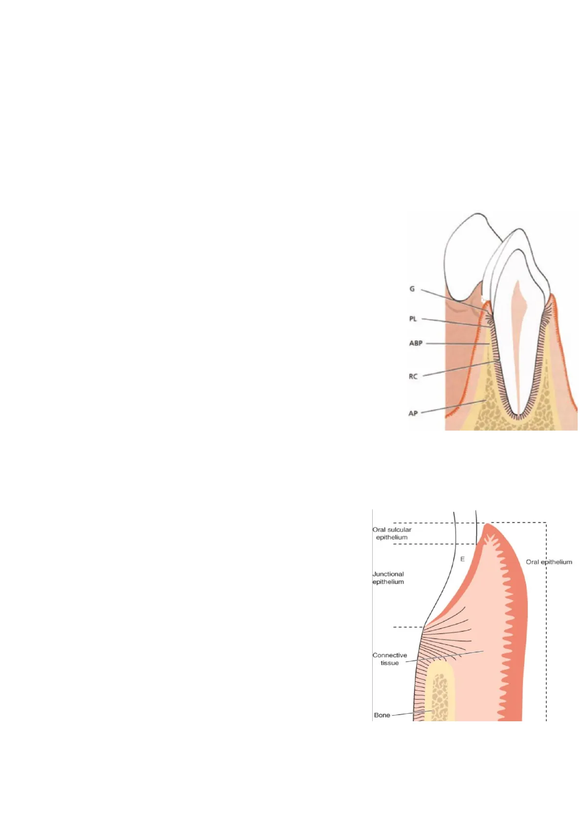 Gengiva Si divide in due porzioni: -Libera -Aderente Queste sono costituite da due tessuti: -Epitelio > diviso a sua volta per diverse morfologie e funzioni, visto la proveniente embrionale differente, in: 1. Ep. orale 2. Ep. sulculare 3. Ep. giunzionale -Tessuto connettivale: costituito da un complicato sistema di fibre sovracrestali. La gengiva ha un colore diverso a seconda della zona perché la prima porzione è costituita da tessuto cheratinizzato: la cheratinizzazione crea una barriera che riduce la permeabilità di alcune sostanze e crea una struttura più resistente al traumatismo meccanico. Dall'altra parte la mucosa alveolare è una struttura elastica ma che porta con se anche struttura muscolari che garantisce una Oral sulcular epithelium stabilità meccanica. Guardando in senso corono-apicale una sezione di dente si ha: - Margine gengivale - Solco gengivale: è uno spazio limitato di circa 1-2mm; questo è costituito da un epitelio orale sulculare e da un epitelio giunzionale più apicale; la parte esterna è definito epitelio orale. - Giunzione smalto-cemento: là dove inizia il cemento, inizia l'attacco connettivale - Fibre connettivale sovracrestali - Cresta ossea - Legamento parodontale Nella parte esterna abbiamo la linea muco-gengivale che separa il tessuto cheratinizzato della gengiva aderente dalla mucosa alveolare. Il tessuto connettivo del parodonto ha una forte capacità rigenerativa visto la quantità di cellule e vasi, al contrario della gengiva.