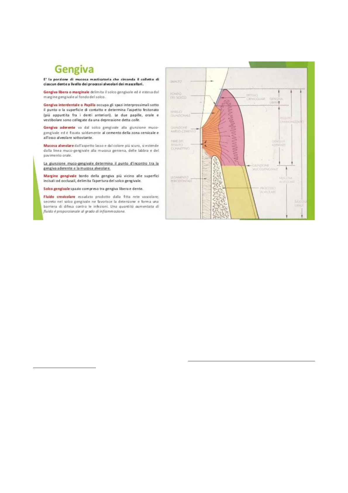 Gengiva E' la porzione di mucosa masticatoria che circonda il colletto di ciascun dente a livello dei processi alveolari dei mascellari. Gengiva libera o marginale delimita il solco gengivale ed è estesa dal margine gengivale al fondo del solco. Gengiva interdentale o Papilla occupa gli spazi interprossimali sotto il punto o la superficie di contatto e determina l'aspetto festonato (più appuntita fra i denti anteriori], le due papille, orale e vestibolare sono collegate da una depressione detta colle. Gengiva aderente va dal solco gengivale alla giunzione muco- gengivale ed è fissata saldamente al cemento della zona cervicale e all'osso alveolare sottostante. Mucosa alveolare dall'aspetto lasso e dal colore più scuro, si estende dalla linea muco-gengivale alla mucosa geniena, delle labbra e del pavimento orale. La giunzione muco-gengivale determina il punto d'incontro tra la gengiva aderente e la mucosa alveolare. Margine gengivale bordo della gengiva più vicino alle superfici incisali od occlusali, delimita l'apertura del solco gengivale. Solco gengivale spazio compreso tra gengiva libera e dente. Fluido crevicolare essudato prodotto dalla fitta rete vascolare; secreto nel solco gengivale ne favorisce la detersione e forma una barriera di difesa contro le infezioni. Una quantità aumentata di fluido è proporzionale al grado di infiammazione.