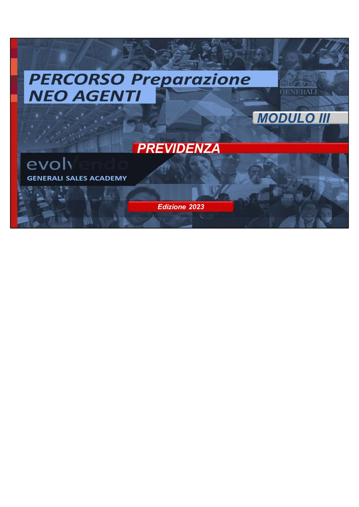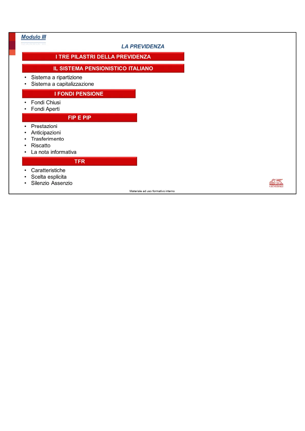Slide da Generali Sales Academy su Previdenza - Modulo III. La Pdf esplora il sistema previdenziale italiano, analizzando i tre pilastri, il sistema pensionistico e i fondi pensione. Questo documento di Economia, adatto per la Formazione professionale, è una risorsa formativa interna per gli agenti.